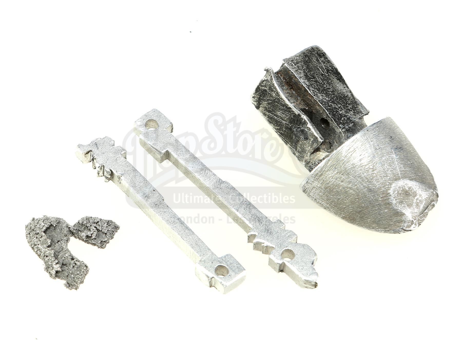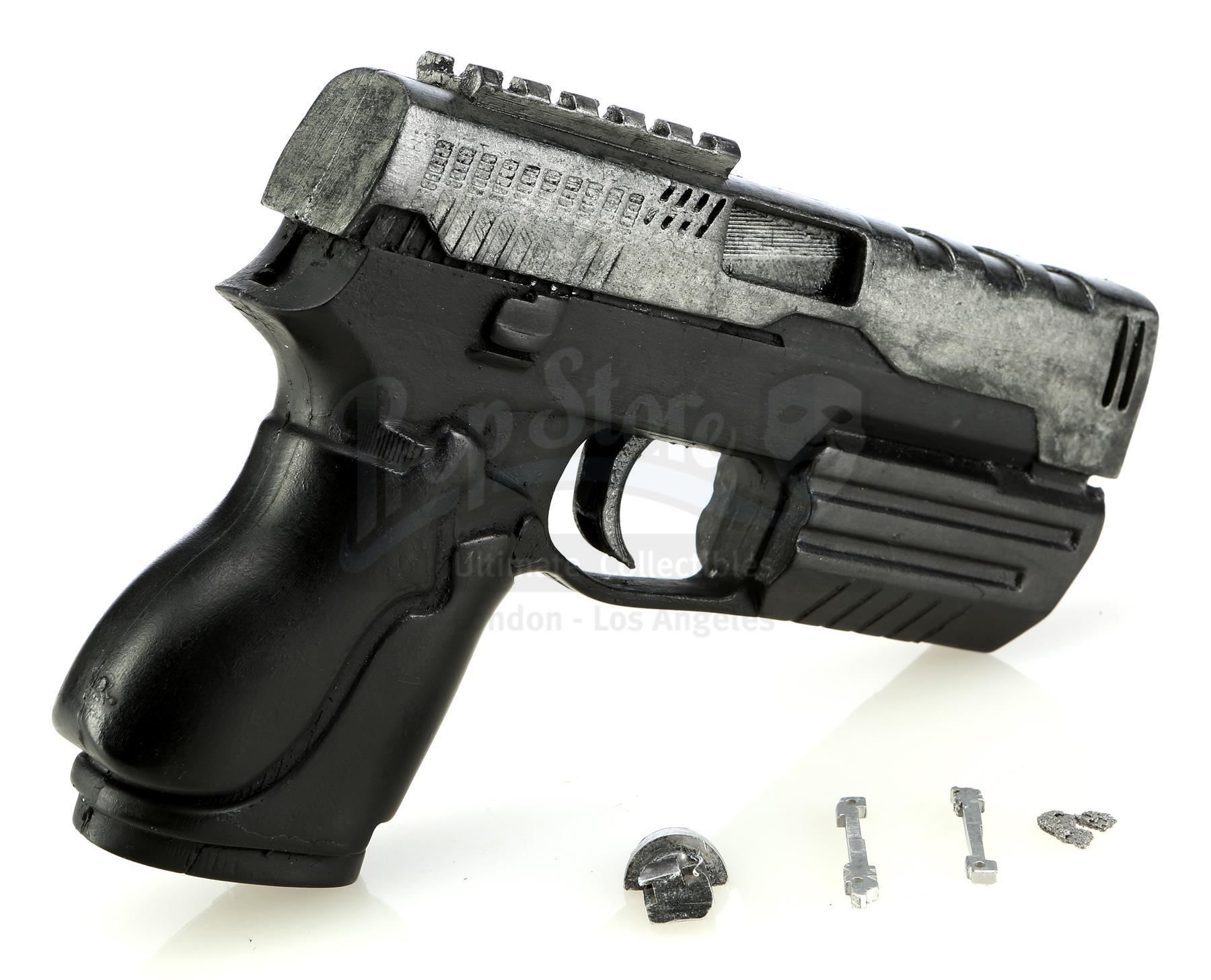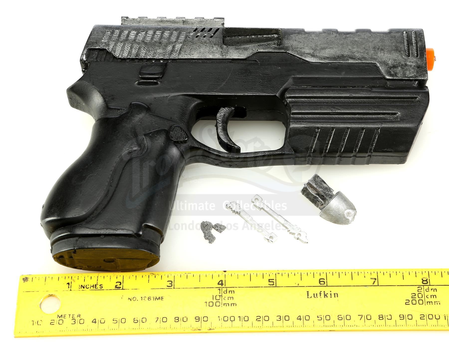 Judas bullet fragments and a stunt Hammertech pistol from the episodes 'Soul Brother #1' (201) and 'Straighten it Out' (202) of Marvel's Luke Cage. In the episodes, Luke Cage presents Mariah Dillard with the fragments of a 'Judas' bullet she hired Arturo 'El Rey' Rey to kill Cage with. Later, Hernan 'Shades' Alvarez shoots Rey for failing to do so. This lot consists of four metal and resin bullet fragments and a black and metal-color foam rubber stunt pistol. The lot is in good overall condition with some wear from production. A blaze orange plug was affixed to the end of the gun after production in order for it to be sold as a collectible.