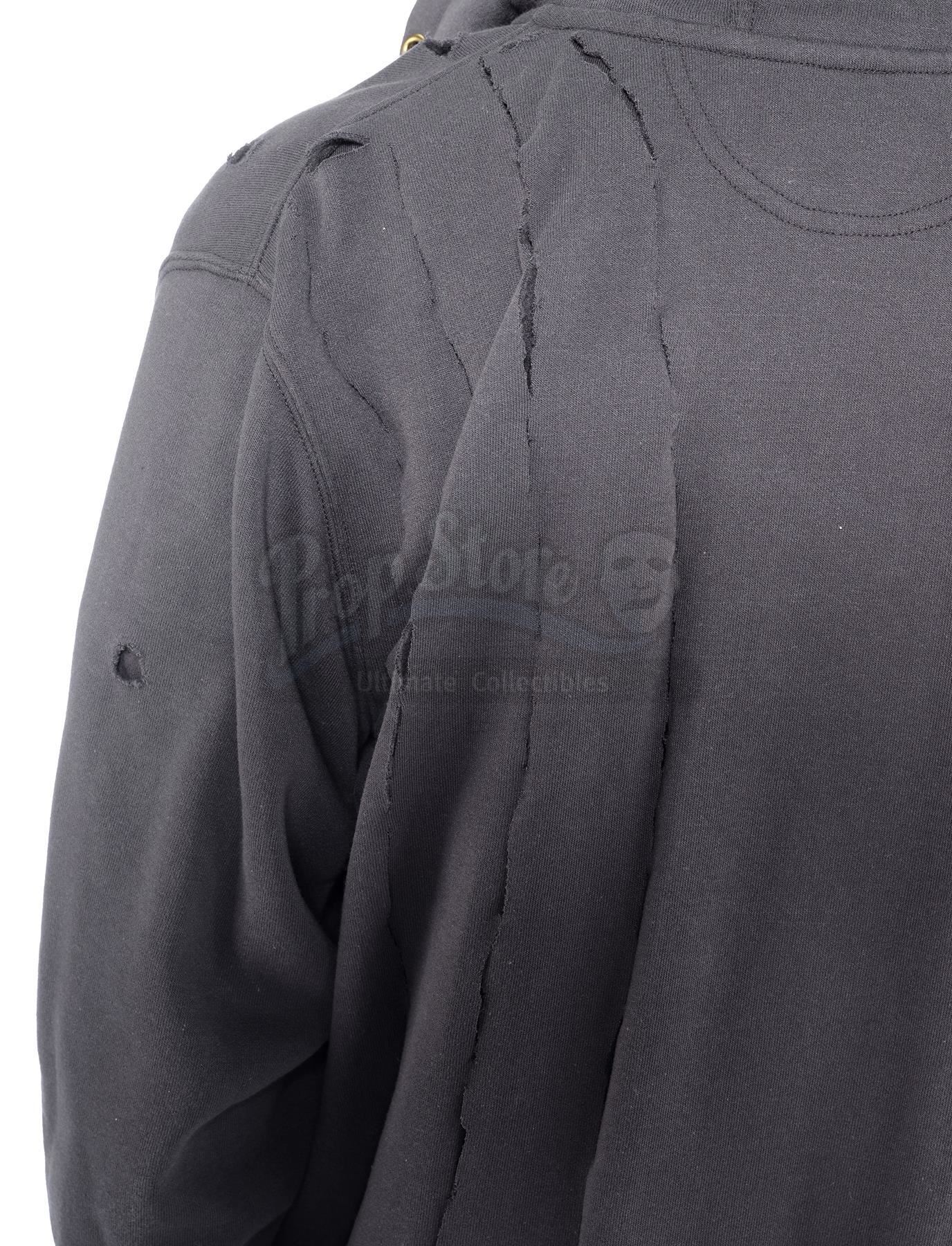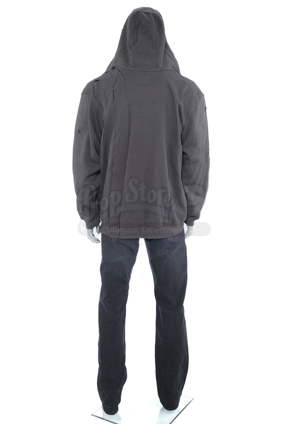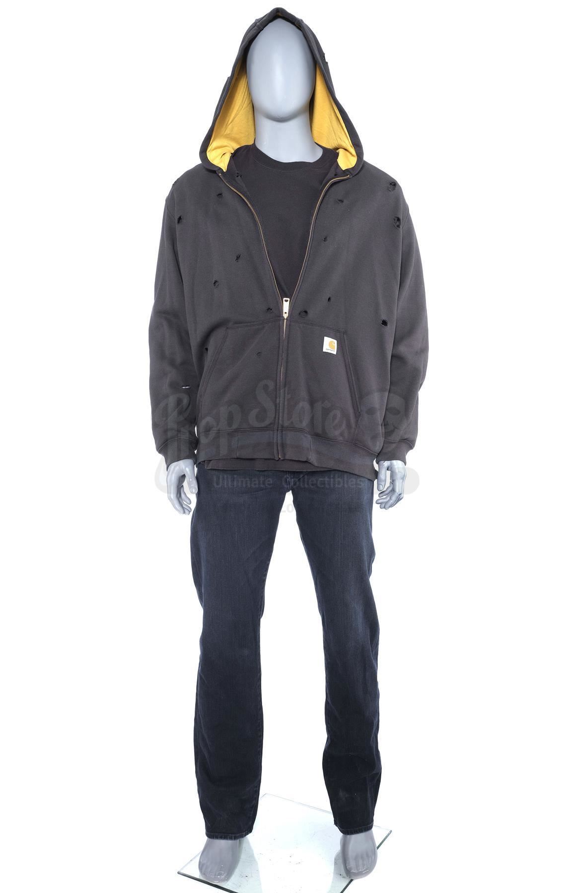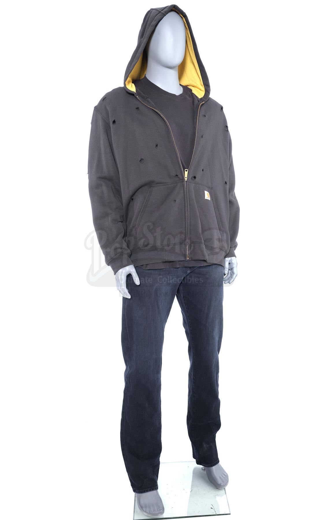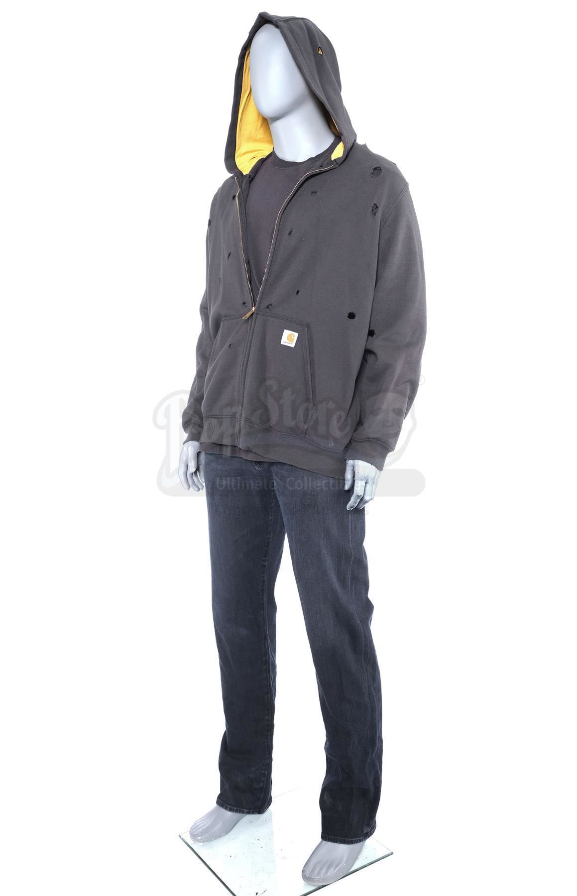 Luke Cage's stunt protection of Piranha costume from the episode 'The Basement' (206) of Marvel's Luke Cage. In the episode, Cage wears his bullet-riddled hoodie while he and Raymond 'Piranha' Jones are pursued by the Stylers. This lot consists of a charcoal and yellow cotton and polyester zip-up hoodie, a black cotton and polyester T-shirt, and dark blue jeans. The lot is in good overall condition with extensive bullet holes in the sweatshirt and T-shirt from production.