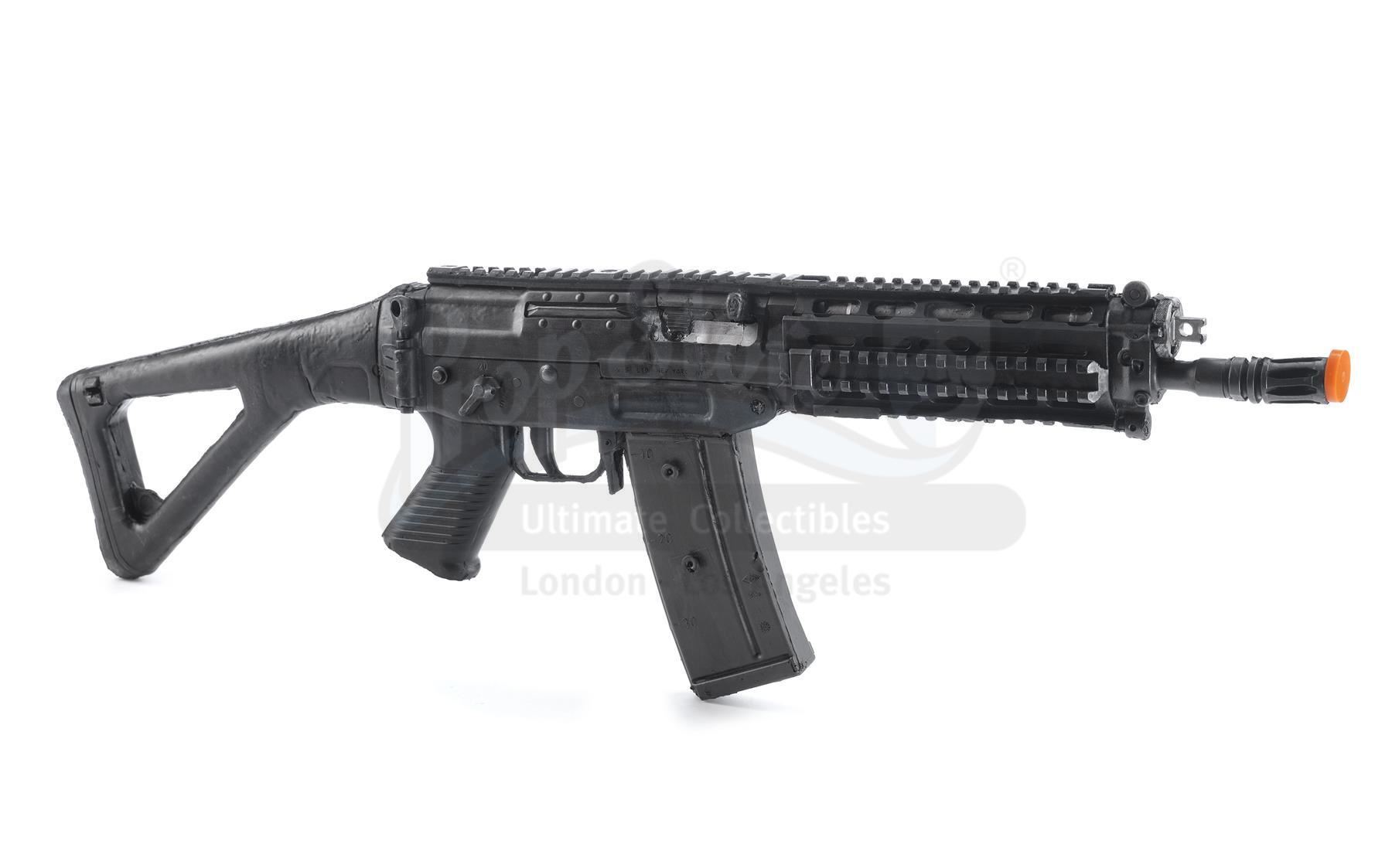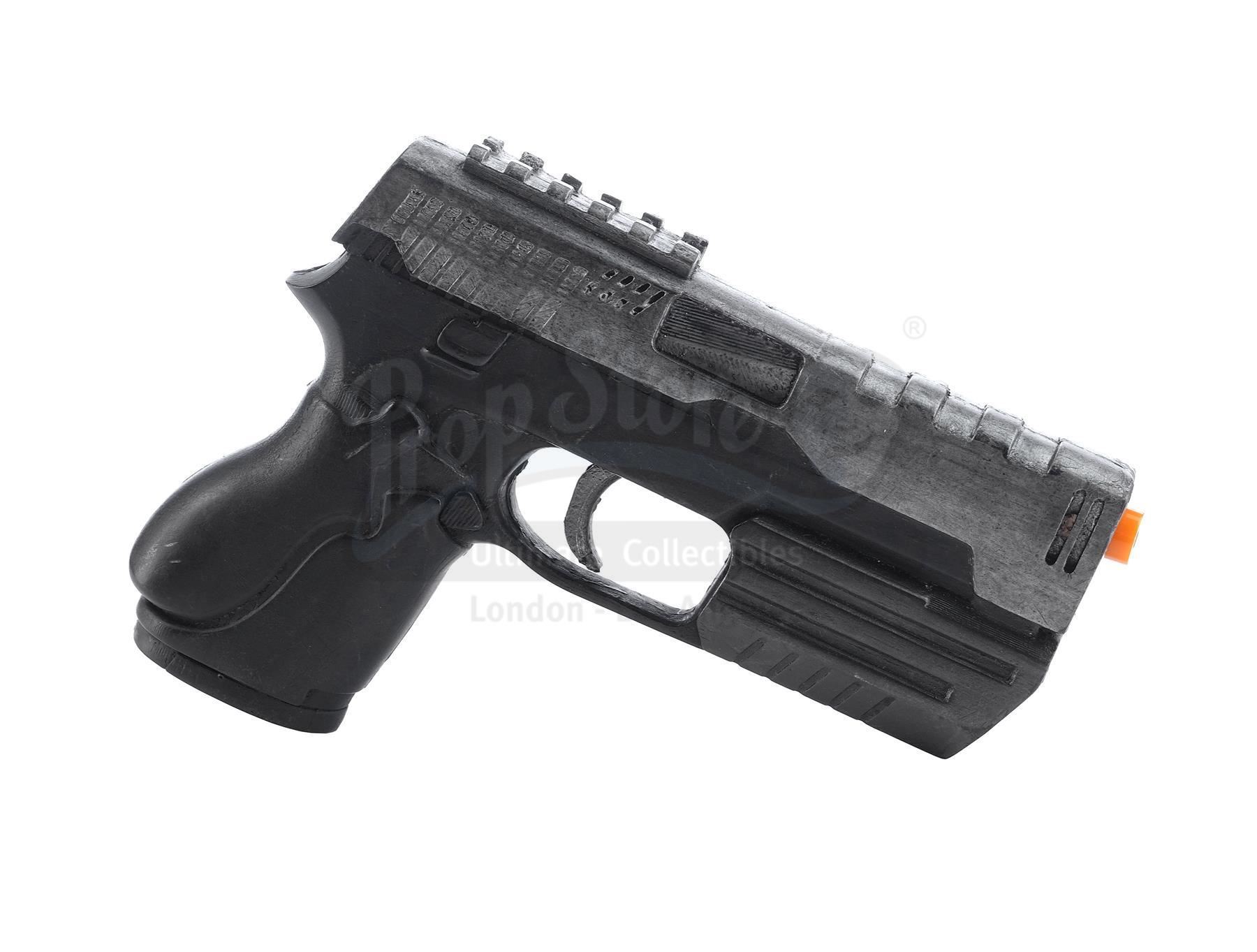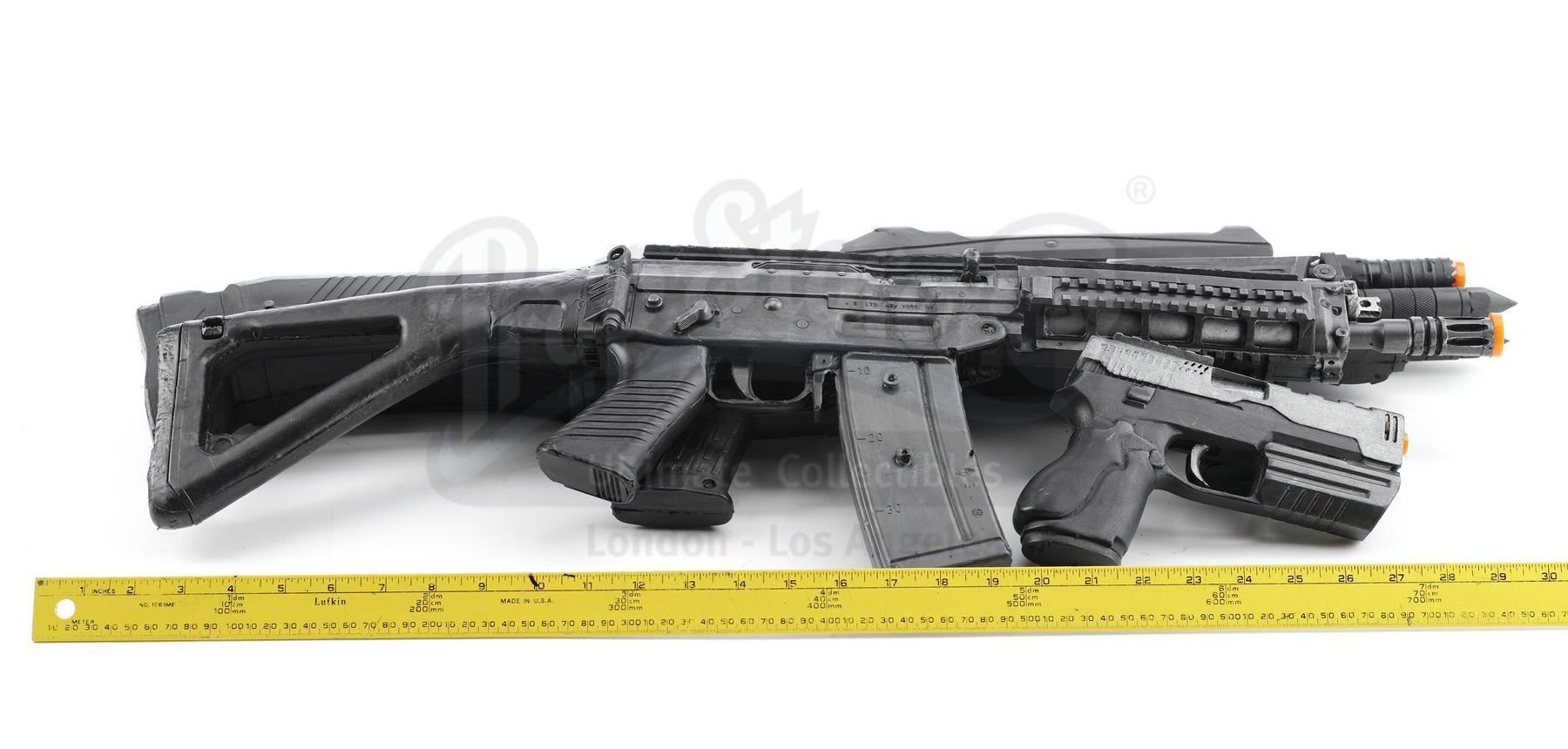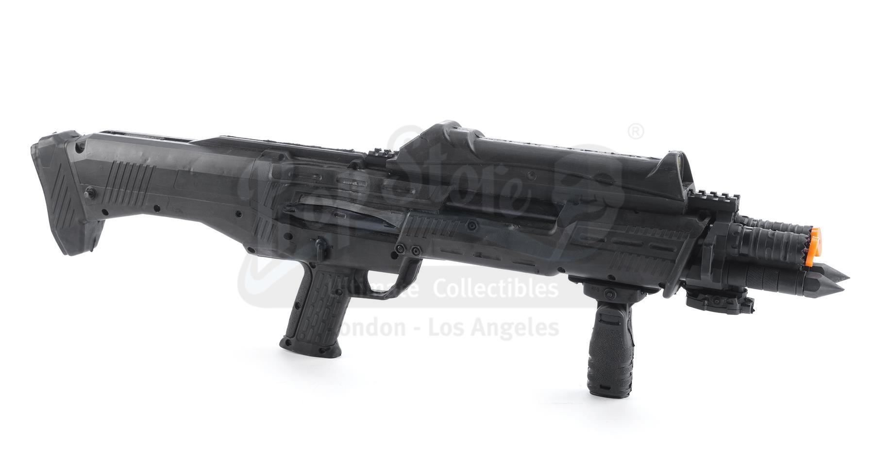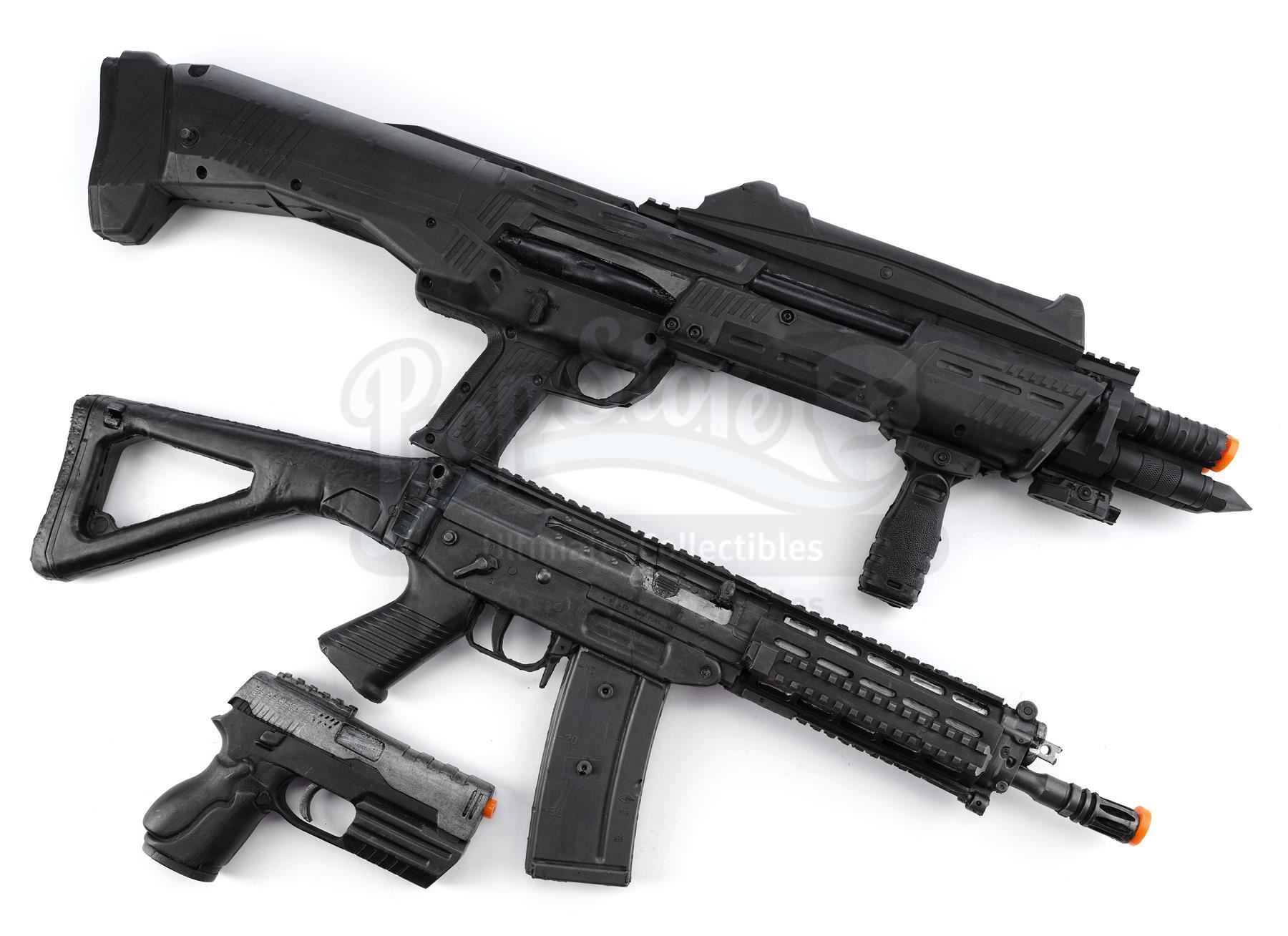 A set of three stunt weapons from Season 2 of Marvel's Luke Cage. Multiple characters wield high-powered weaponry throughout the season, including Arturo 'El Rey' Rey, his murderer Hernan 'Shades' Alvarez, John 'Bushmaster' McIver's men, and Mariah Dillard. This lot consists of a black and silver dense foam stunt semi-automatic pistol with a lower receiver molded around a metal rod, a black and metal-color foam rubber Hammertech stunt pistol, and a black foam rubber stunt DP-12 shotgun with a pair of grips. The lot is in good overall condition with some warping and paint scuffing from production. A blaze orange plug was affixed to the end of each gun after production in order for it to be sold as a collectible.