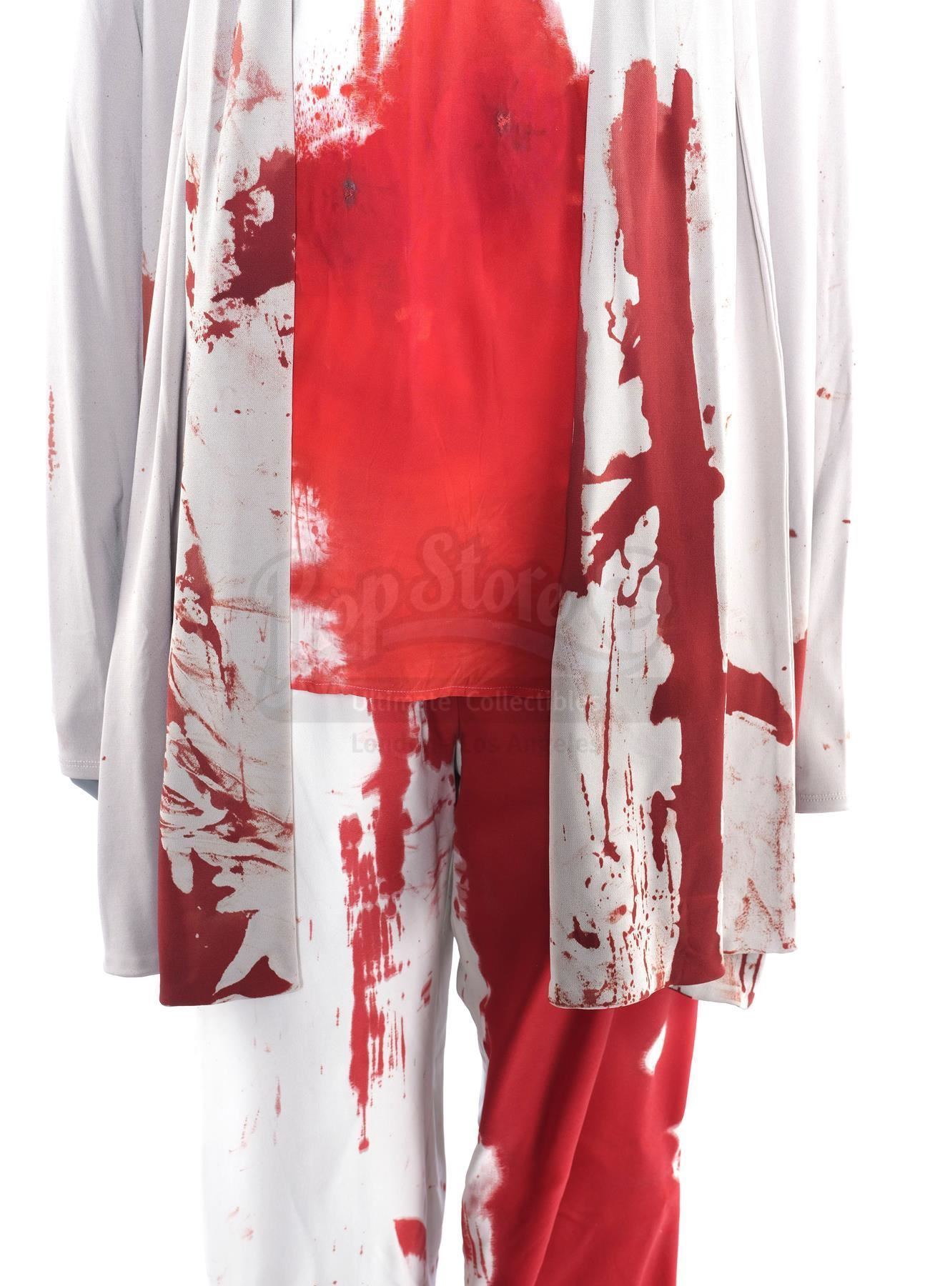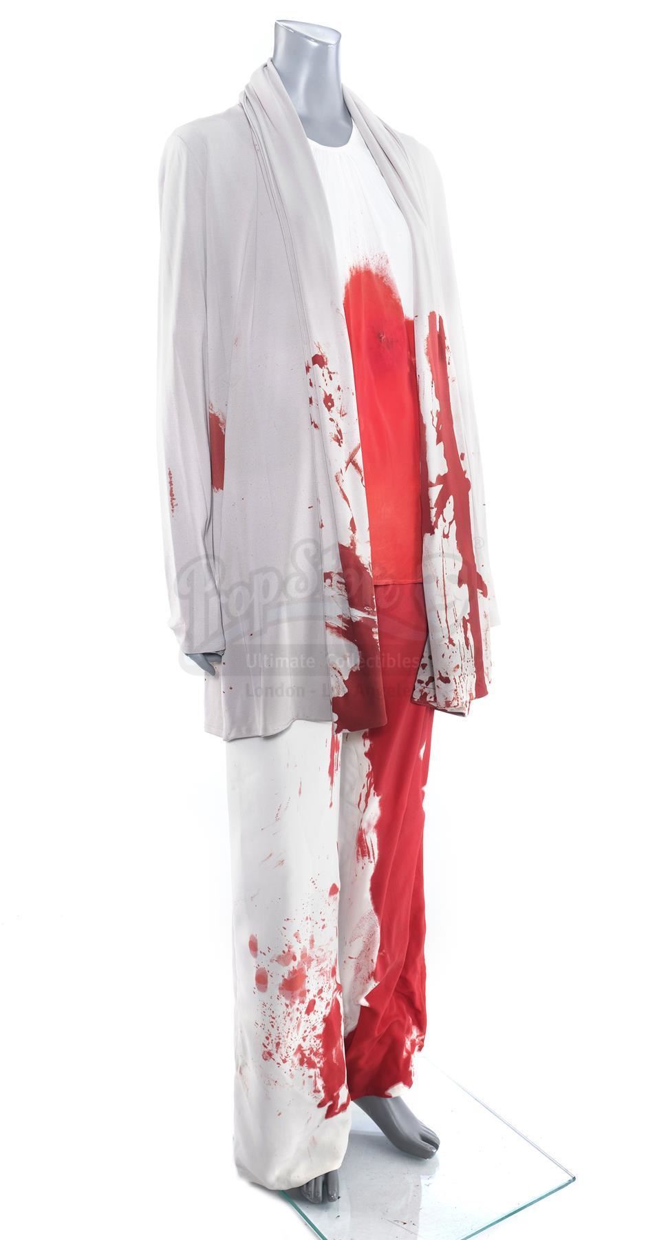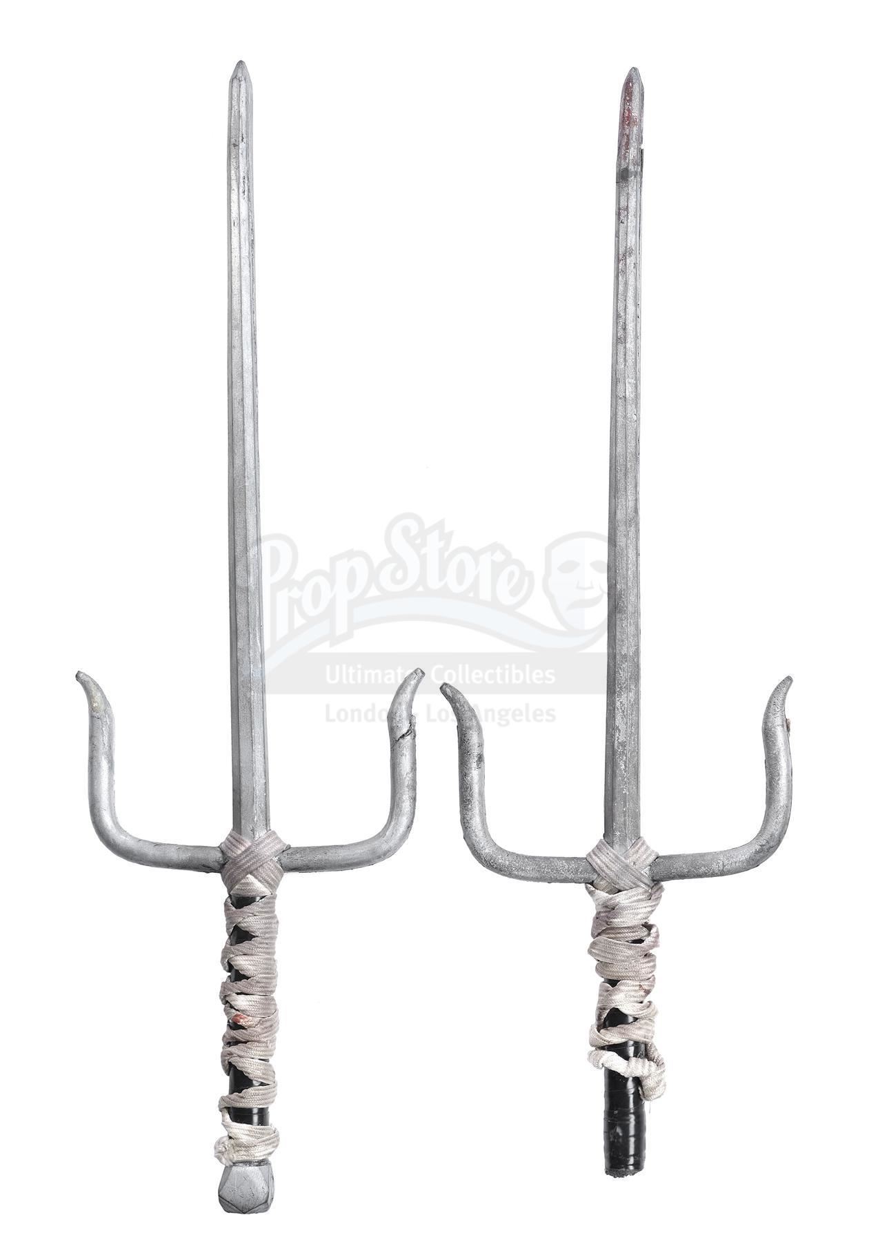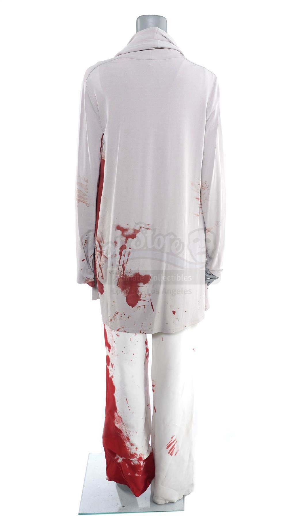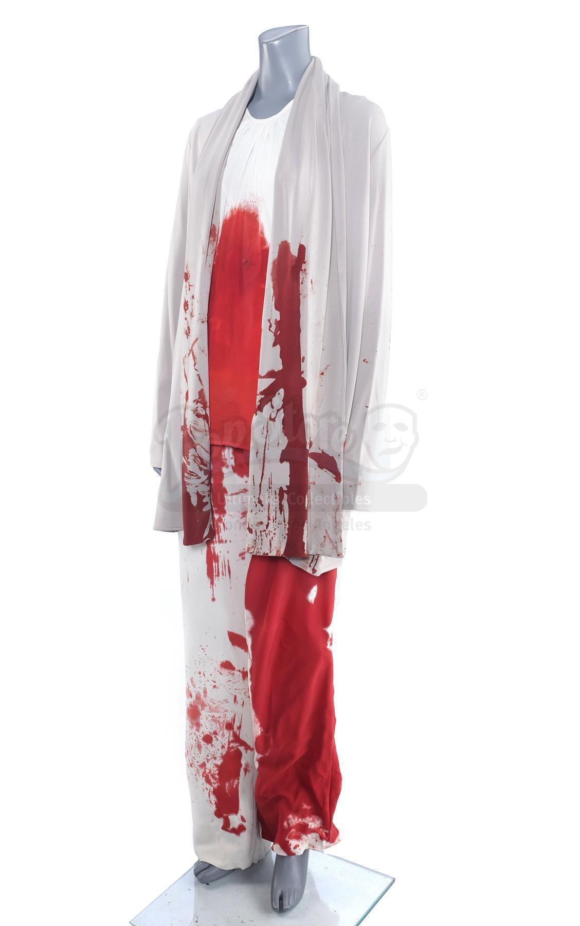 Elektra Natchios' stunt sais with Alexandra Reid's bloodied death costume from the episode 'Ashes, Ashes' (106) of Marvel's The Defenders. In the episode, Reid wears her costume when her former pupil, Natchios, forcibly takes control of The Hand. This lot consists of a blood-stained gray viscose and polyester blend cardigan, a cream-color silk blend blouse, a white cotton undershirt, cream-color polyester blend pants, and a pair of rubber and urethane sais with nylon-wrapped handles. The lot is in good overall condition with a missing pommel and some distressing to the sais from production.