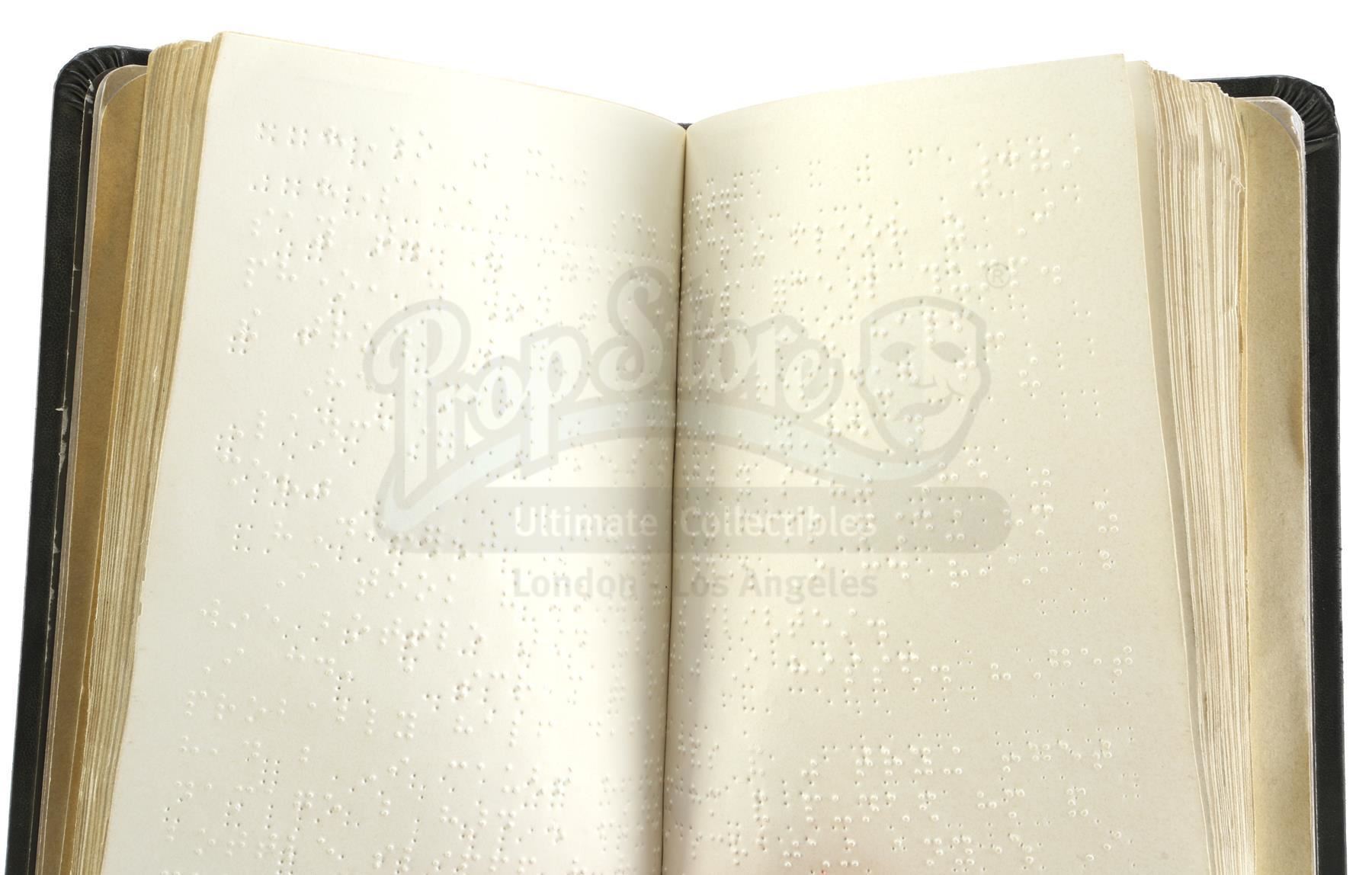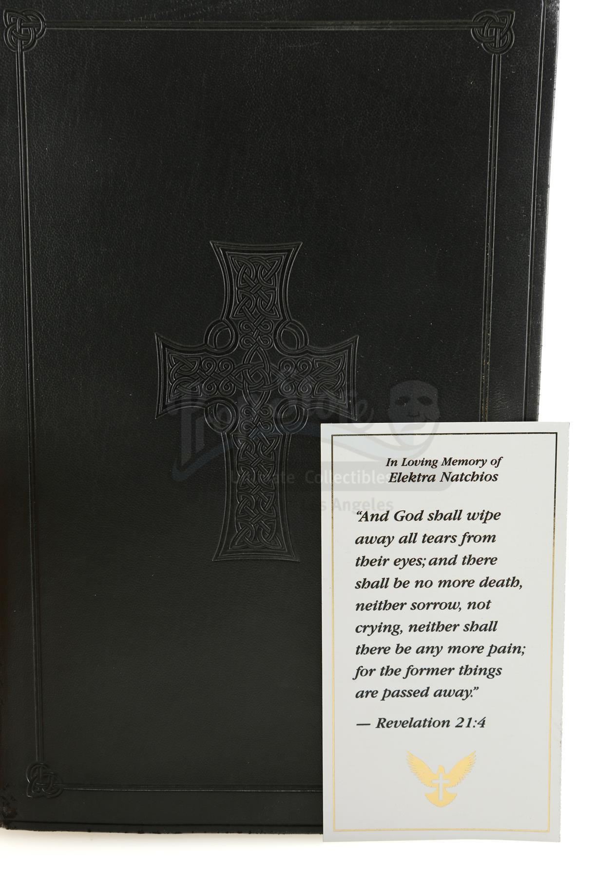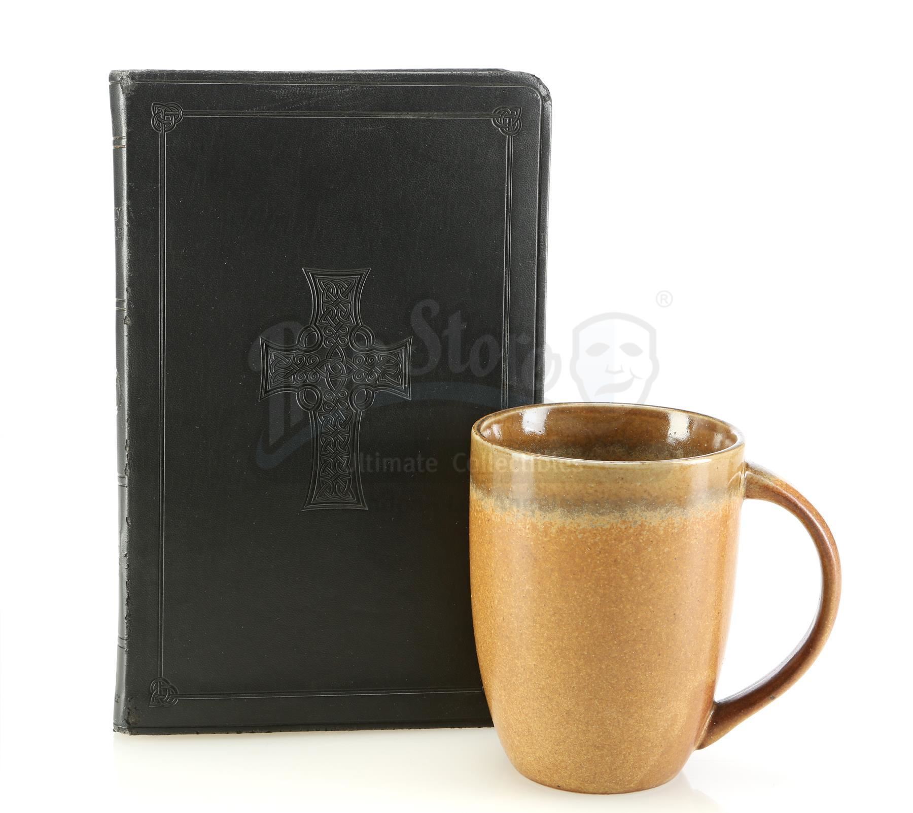 Matt Murdock's braille bible, funeral program, and mug from the episode 'Ashes, Ashes' (106) of Marvel's The Defenders. In the episode, Elektra Natchios finds a program for her own funeral in a braille bible in Matt Murdock's apartment, and flashes back to her relationship with him. This lot consists of a black leatherette-bound bible with braille test, a glossy cream-color paper funeral program with gold details, and a ceramic mug labeled 'Hero' by production. The lot is in good overall condition with minor signs of wear throughout.