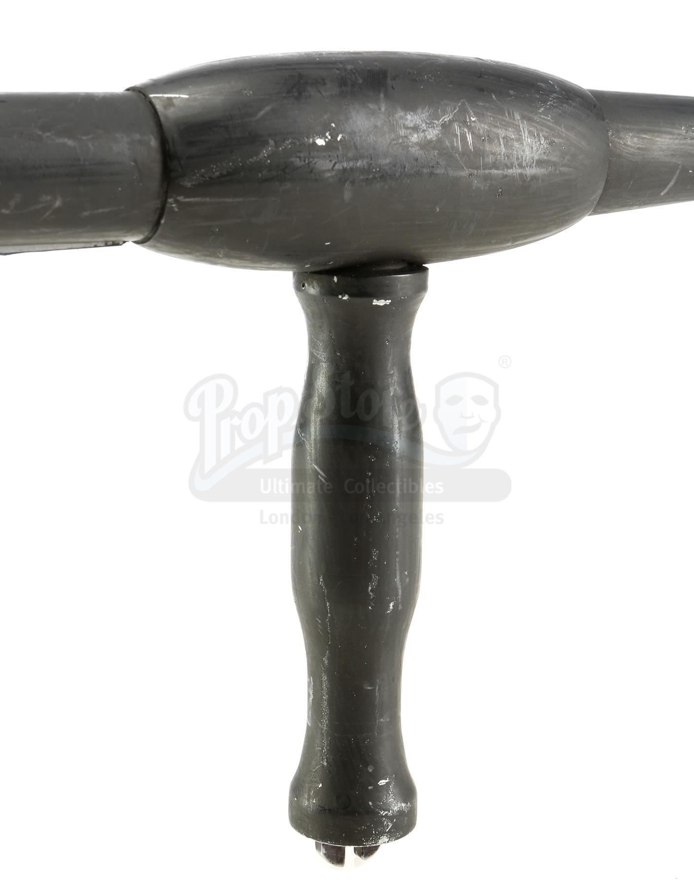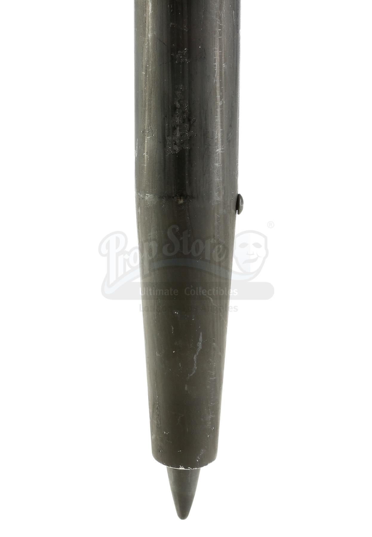 Murakami's retractable SFX tonfa from the episodes 'Take Shelter' (105) and 'Fish in the Jailhouse' of Marvel's The Defenders. In the episodes, Murakami uses his signature tonfa against members of The Defenders. This black steel and urethane tonfa with retractable points on each end for SFX inserts is in good overall condition with some scuffing from production.