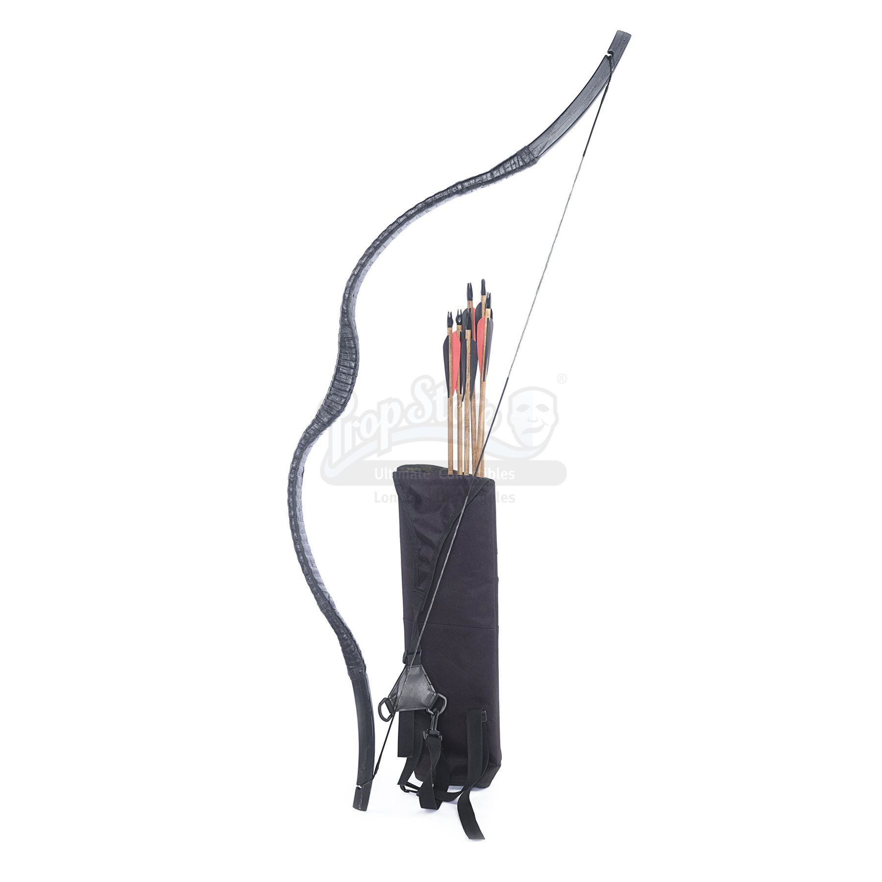 The Hand bow and arrows from the episode 'Worst Behavior' (103) of Marvel's The Defenders. In the episode, Alexandra Reid presents the resurrected Elektra Natchios with a rack of The Hand's weapons. This lot consists of a black rubber and urethane crossbow with a wire string, six tipless wooden arrows with black and red fletching, and a black nylon arrow pouch. The lot is in excellent overall condition with minor signs of wear from production throughout.