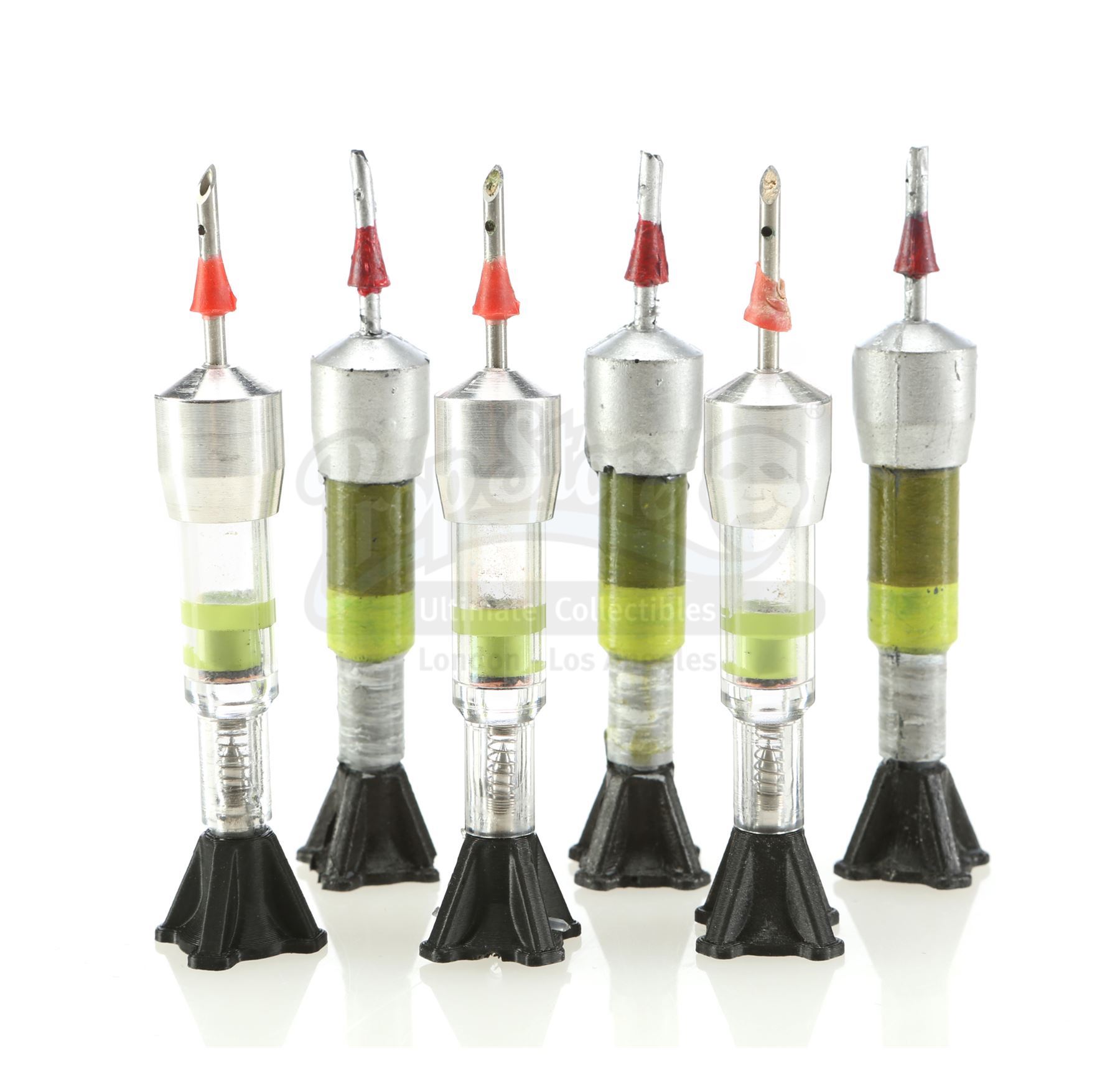 The Hand's set of six tranquilizer darts from Season 1 of Marvel's The Defenders. Agents of The Hand neutralize enemies with specialized tranquilizer darts throughout the season. This lot consists of three metal-tipped clear plastic darts and three rubber stunt darts. It is in good overall condition with minor signs of wear from production throughout.