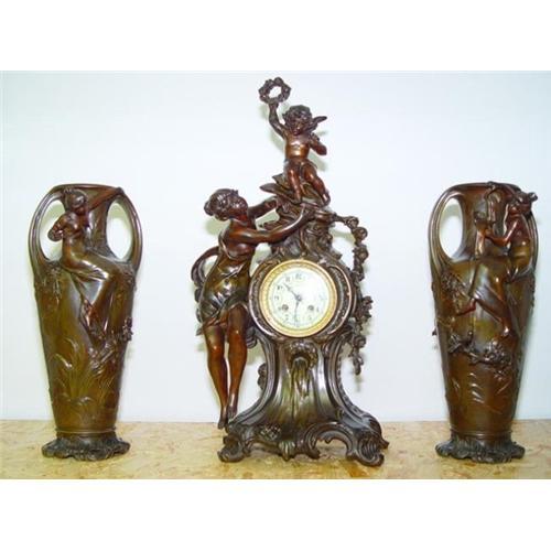 This magnificent three piece clockset looks marvellous. This is the kind of piece that top designers can't wait to get their hands on to add a one-of-a-kind look to their best decors! The style of this clockset is Renaissance and dates about 1880. The clockwork is in perfect condition and runs on time.On the top of the clock is a cherub with a garland looking to a woman. The dimensions are: Clock: Height 23 Inches,Width 11 Inches and Depth 8 Inches.Sidepieces: Height 16 Inches,Width 8 Inches and Depth 8 Inches. It would be the most luxurious clockset for a high end lawyers or executives office!Shipping costs to the US are 225 US$.After payment you will receive the set in about 4 days.Thank you for looking this marvellous clcokset!