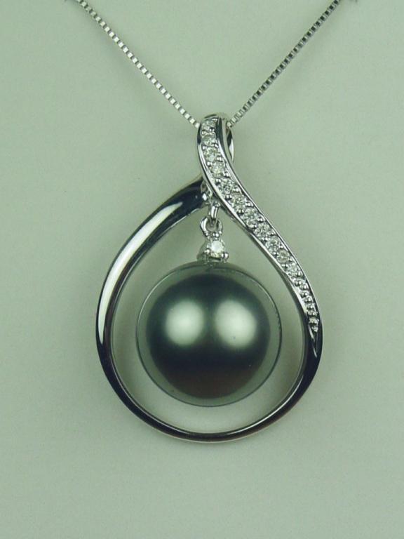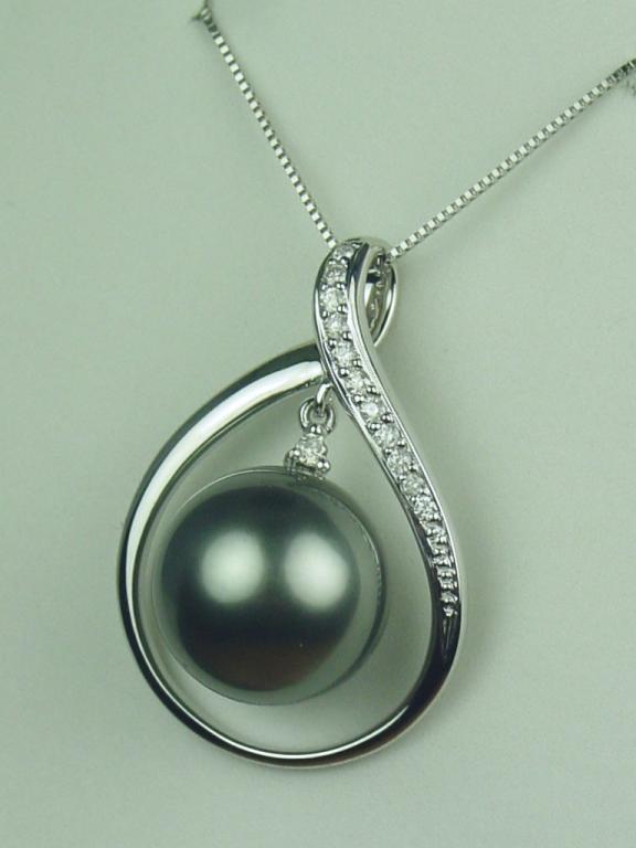 Marvelous 14 karat white gold ladies custom made pendant set with a center fine round black pearl averaging 10.mm-11.00 mm and pave set with 12 round diamonds weighing approx. 0.10 carats of H-I colors. Retail $1,750.00Estimate $600-$800