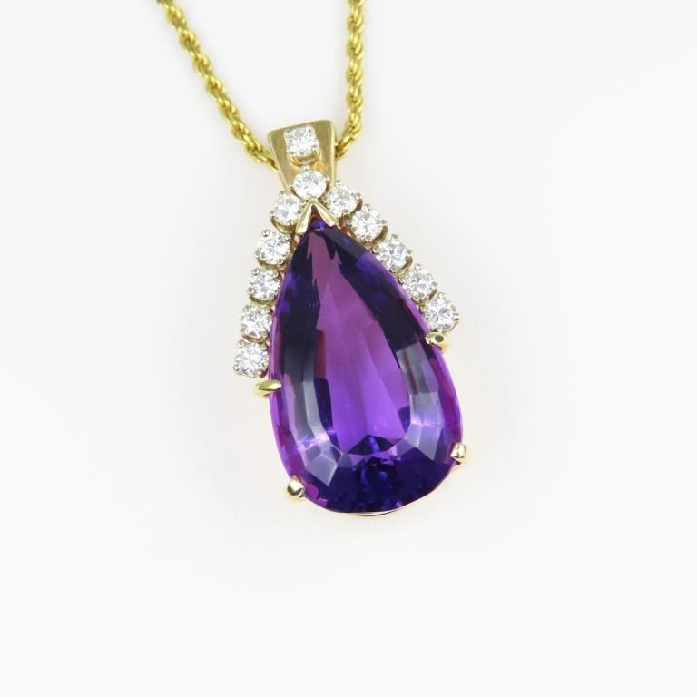 featuring a pear shaped vivid purple Amethyst weighing approx. 20.00-25.00 carats accented with 12 ‘IDEAL ‘cut Diamonds weighing approx. 0.60 carats with G-H colors and VS clarity set in an impressive custom 14 karat yellow gold setting. Retail $5,000-$6,000 Estimates