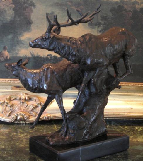 Male and Female Elk Bronze Sculpture, After Barye 13"H x 12"W x 9"D 22 lbs. This bronze sculpture was produced using the "Lost Wax" casting method. The"Lost Wax" Cast method is the most precise metal casting technique in existence, ensuring exquisite detail of the original host model which is usually sculpted in clay or wax. This "Lost Wax" casting method is an extremely labor intensive and expensive process, but the end results produce a Heirloom Quality Masterpiece!Antoine-louis Barye (1796 - 1875) Originally trained as a goldsmith, Antoine-Louis Barye served in Napoleon's army before studying sculpture and painting. He entered the Ecole des Beaux-Arts in 1818 and adapted the romantic-style subject matter of violent and majestic animals. After his crocodile-like sculpture entitled Tiger Devouring a Gavail, won a medal at the Salon of 1831, Barye became a successful and independent sculptor and painter. His animal sculptures competed at the Salon alongside the more traditional and revered human figures. In 1845, Barye began a foundry that produced smaller and more affordable bronze statues. He was appointed the keeper of plaster casts at the Louvre and professor of zoological drawing at the Musee National d'Histoire Naturelle, both in Paris. Elected to the Academie in 1868, Barye inspired a later generation of animal sculptors who called themselves the animaliers.