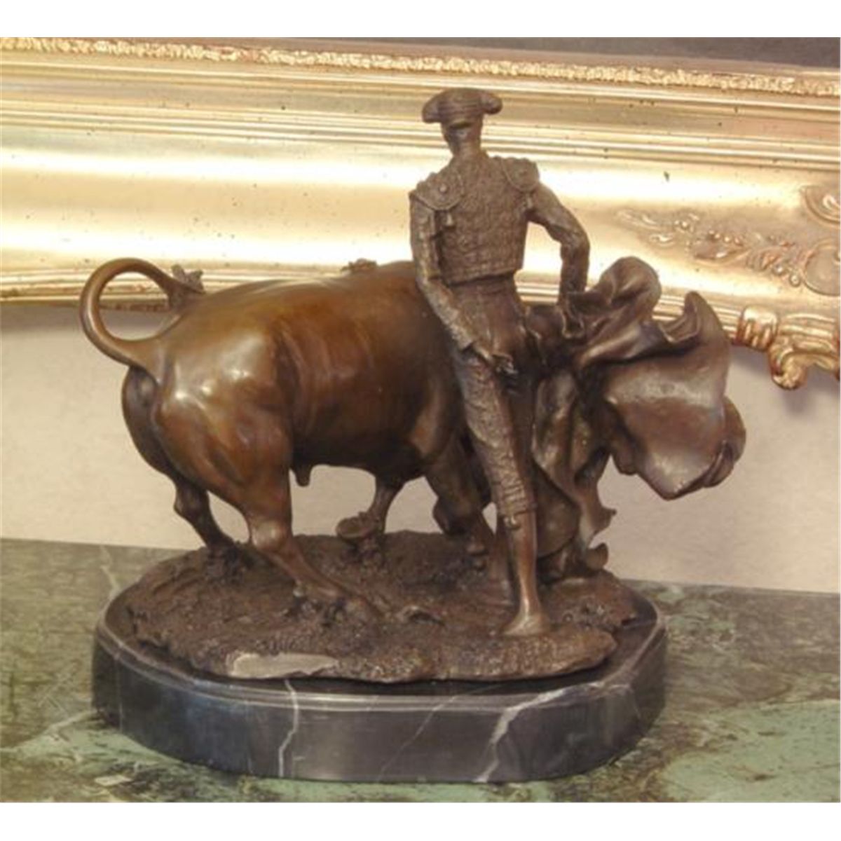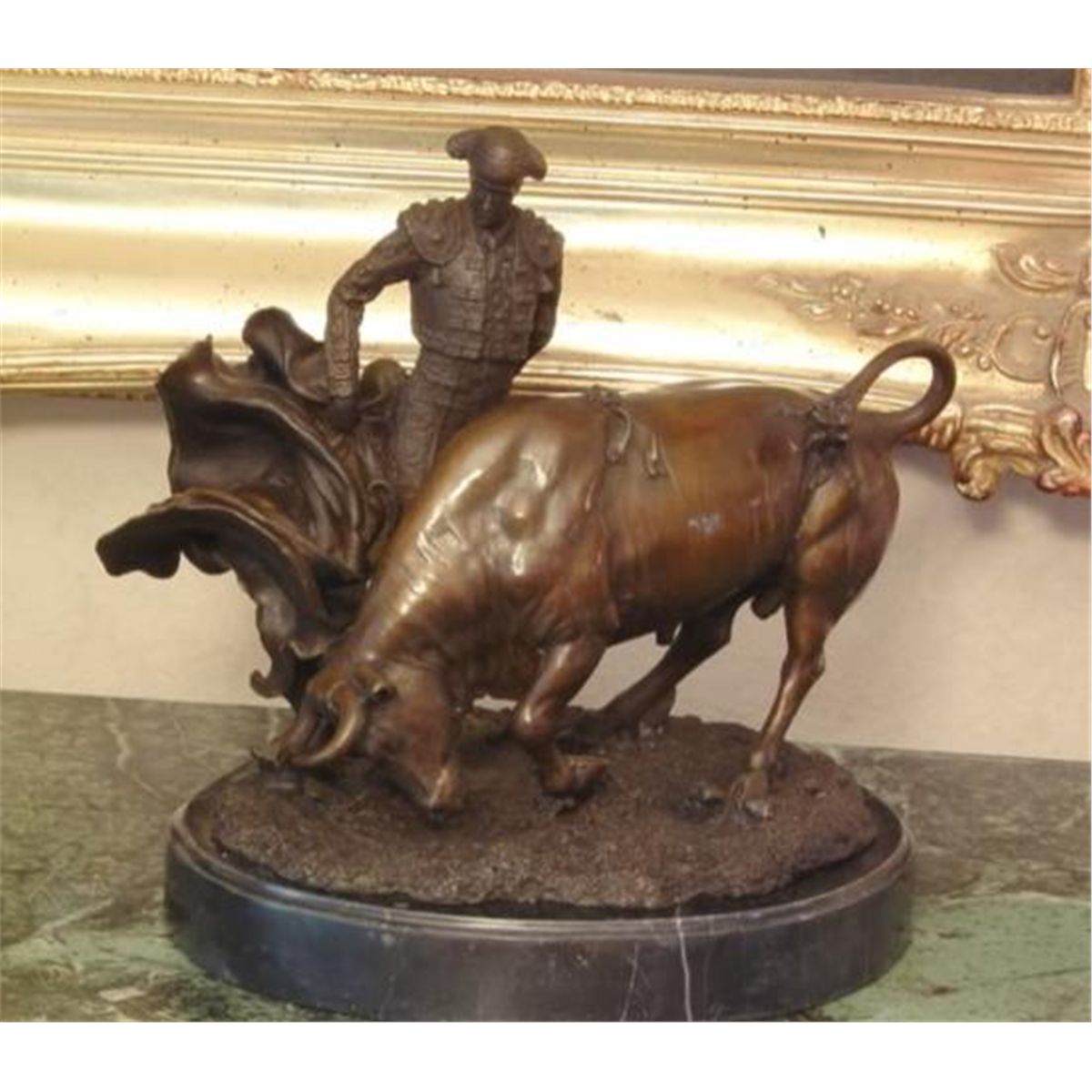 Matador Bronze Sculpture, After Lobo, 12"H x 10"W x 7"D 18 lbs. This bronze sculpture was produced using the "Lost Wax" casting method. The"Lost Wax" Cast method is the most precise metal casting technique in existence, ensuring exquisite detail of the original host model which is usually sculpted in clay or wax. This "Lost Wax" casting method is an extremely labor intensive and expensive process, but the end results produce a Heirloom Quality Masterpiece!A matador or torero is the main performer in bullfighting events in Spain, France, and other Spanish-speaking countries. He or she is the person who performs with and kills the bull. The role is also called toreador in English (and in Bizet's opera Carmen), but this term (older than torero) is actually never used in Spain or in Latin America. The term torero encompasses bullfighters who fight the bull in the ring (picadores and rejoneadores).Usually, toreros start fighting young bulls (novillos or, more informally in some Latin American countries, vaquillas), and are called novilleros. They can start fighting mature bulls after a special match, called "the Alternative". At this bullfight the novillero (junior bullfighter) is presented to the crowd as a matador de toros. Bullfighting is traditionally a male sport. A very small number of women have been matadors and cavaleiras (in Portugal), a recent example being Cristina Sánchez. Female matadors have experienced considerable resistance and hostility from aficionados and other (male) matadors.