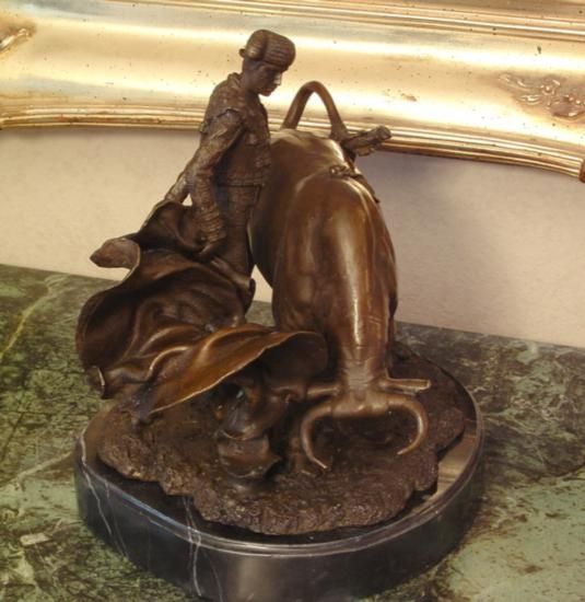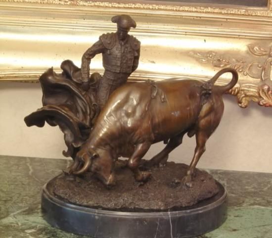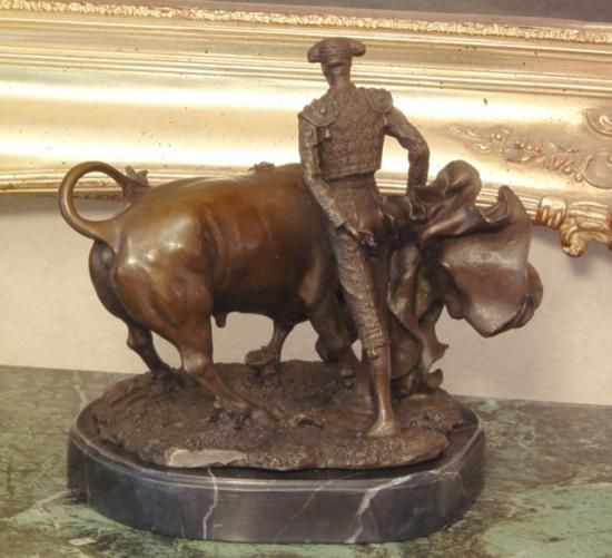 Matador Bronze Sculpture, After Lobo, 12"H x 10"W x 7"D 18 lbs. This bronze sculpture was produced using the "Lost Wax" casting method. The"Lost Wax" Cast method is the most precise metal casting technique in existence, ensuring exquisite detail of the original host model which is usually sculpted in clay or wax. This "Lost Wax" casting method is an extremely labor intensive and expensive process, but the end results produce a Heirloom Quality Masterpiece!A matador or torero is the main performer in bullfighting events in Spain, France, and other Spanish-speaking countries. He or she is the person who performs with and kills the bull. The role is also called toreador in English (and in Bizet's opera Carmen), but this term (older than torero) is actually never used in Spain or in Latin America. The term torero encompasses bullfighters who fight the bull in the ring (picadores and rejoneadores).Usually, toreros start fighting young bulls (novillos or, more informally in some Latin American countries, vaquillas), and are called novilleros. They can start fighting mature bulls after a special match, called "the Alternative". At this bullfight the novillero (junior bullfighter) is presented to the crowd as a matador de toros. Bullfighting is traditionally a male sport. A very small number of women have been matadors and cavaleiras (in Portugal), a recent example being Cristina Sánchez. Female matadors have experienced considerable resistance and hostility from aficionados and other (male) matadors.