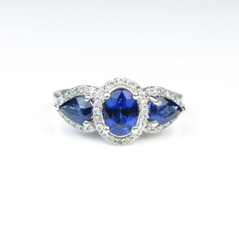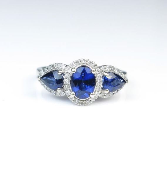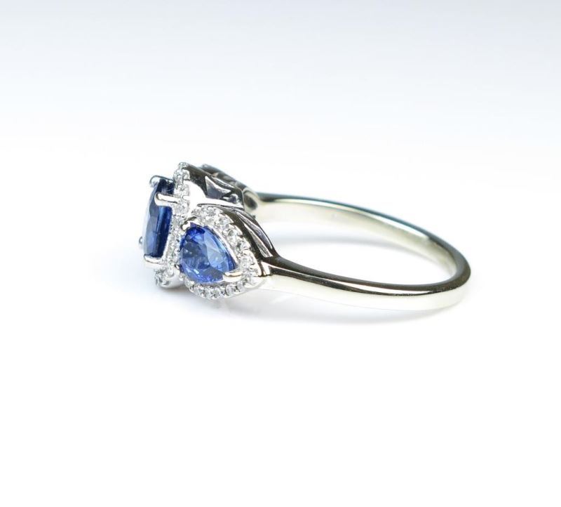 Ring. Features three fine Blue Sapphires weighing approx. 3.00 carats with 46 round full cut Diamonds weighing approx. 0.40 carats of G-H colors and VS/SI clarity set in a contemporary setting of 14K white gold.