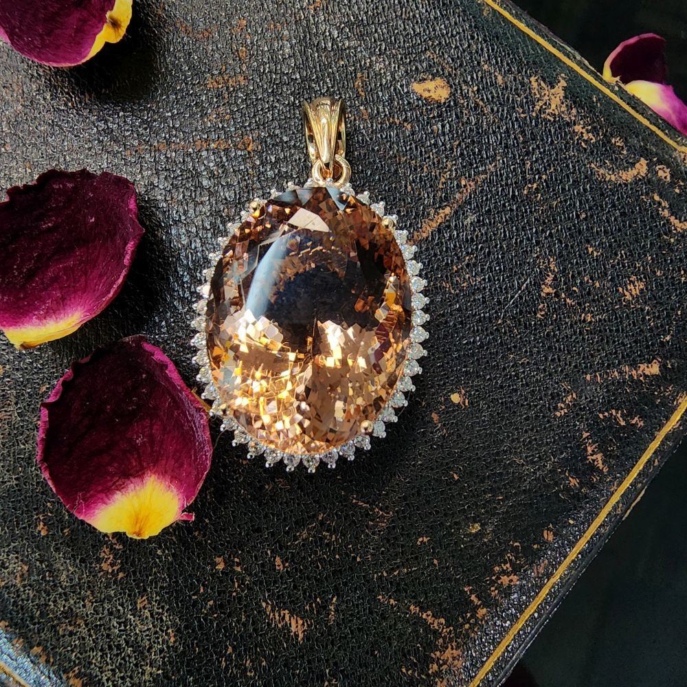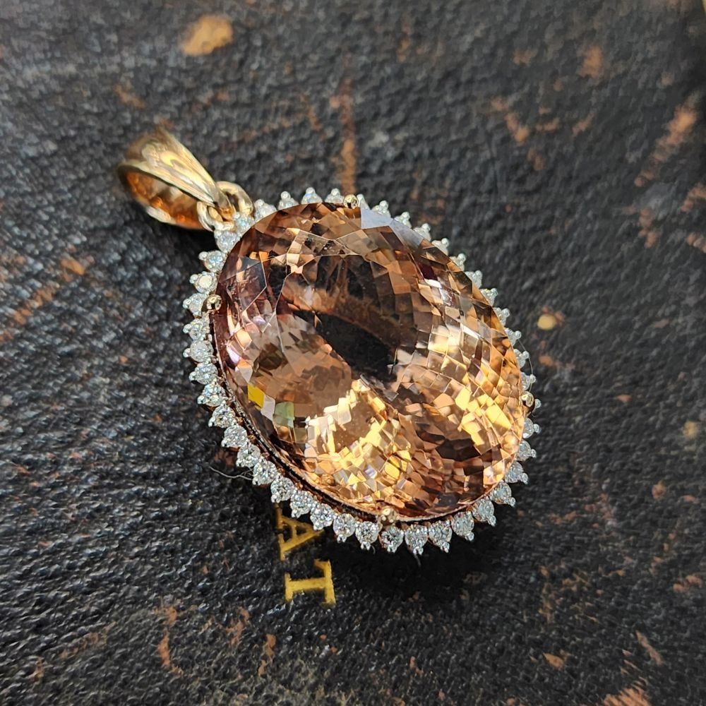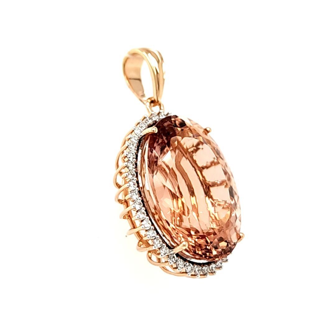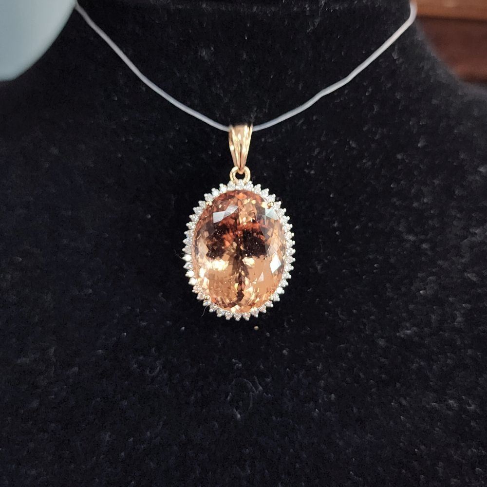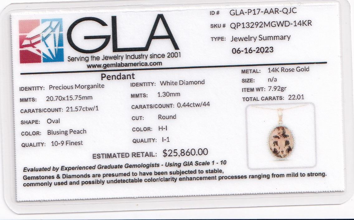 Genuine Morganite and Earth-Mined Diamond Pendant.& nbsp; Morganites have a high degree of brilliance, exceptioanal durability, and breathtaking shades of rose pink.& nbsp; A glowing 21.57 carat oval-cut, prong-set Morganite with .44 carats of round, brilliant-cut, H-I color, I1 clarity diamonds in the floating halo is featured in this 14 karat rose gold pendant. It measures approximately 1 3/8& quot; x 3/4& quot; x 1/2& quot;.& nbsp; & nbsp;The Morganite has a faceted pavilion and is supported by a ribbed under gallery.& nbsp; The pendant hangs from a solid bail that is attached to an affixed jump ring.& nbsp; This pendant is certified and appraised for $25,860.00 estimated retail replacement value.
