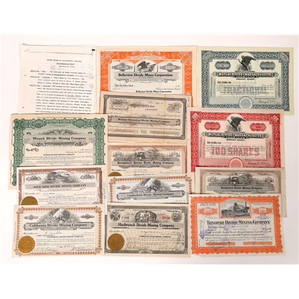 12 Tonopah Divide mining stocks, c. 1919-27. Issued and unissued. Cumberland Divide, Belcher Ext Divide, Mutual Divide of Massachusetts, Gold Zone Div