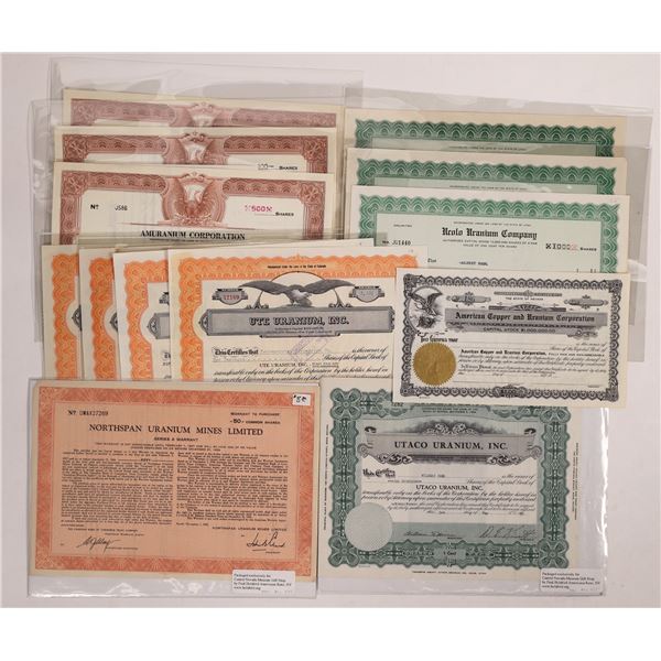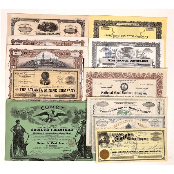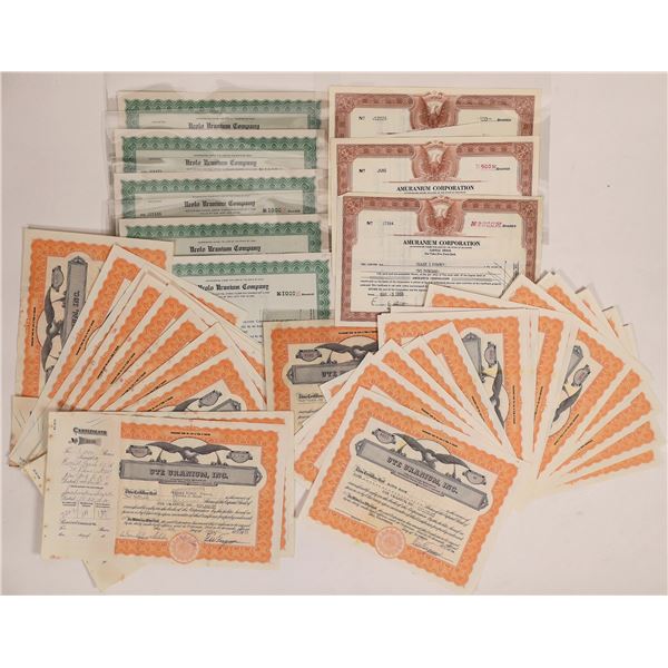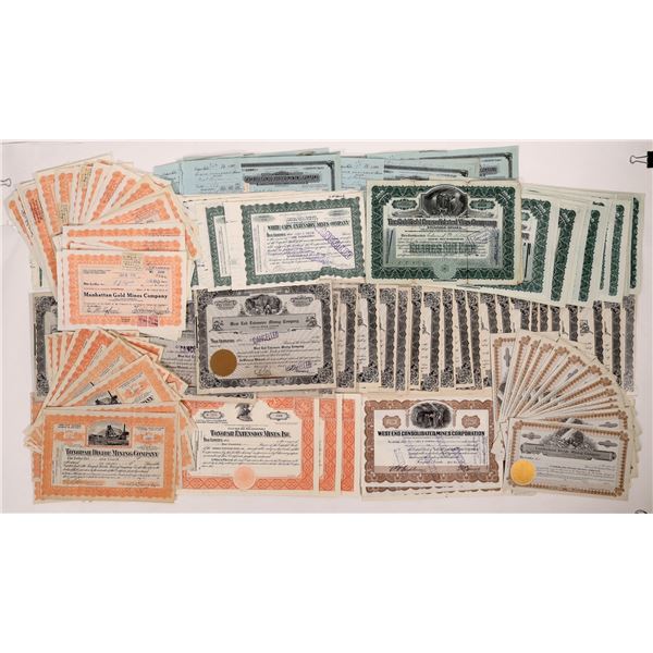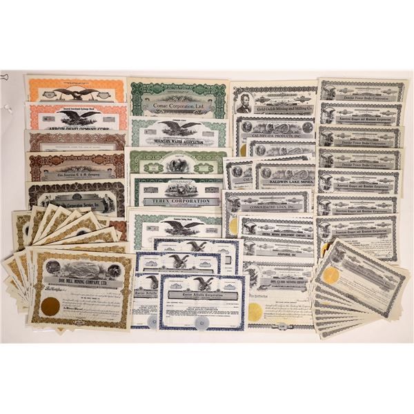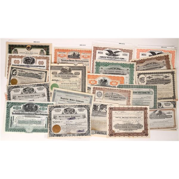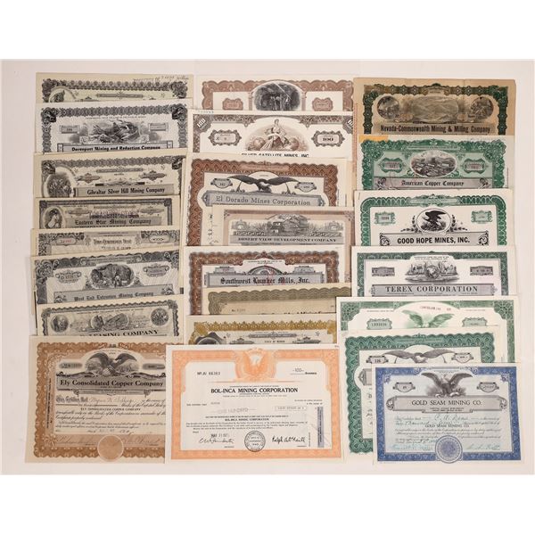 31 assorted issued and unissued Nevada stocks including Mining, c. 1914-56. Tonopah Divide, West End Cons, Kings River Uranium, Combination Metals, Gr