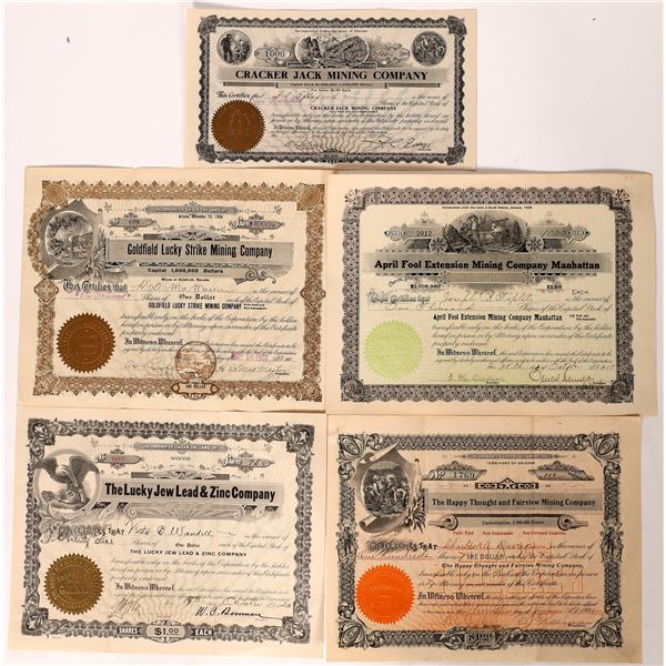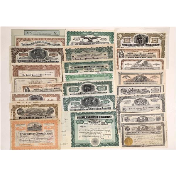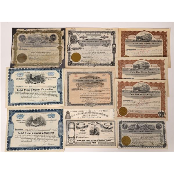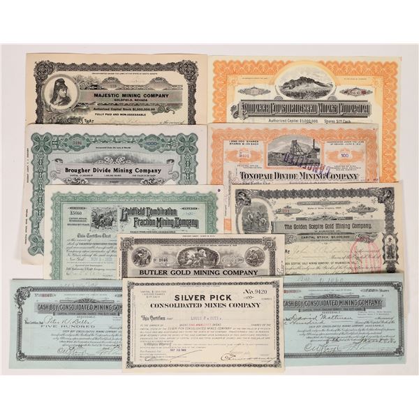 10 Nevada mining stocks. Issued-2x 1920 Cash Boy Con, 1941 Brougher Divide, 1909 Goldfield Combination Fraction, 1896 Golden Sceptre Gold, 1919 Tonopa