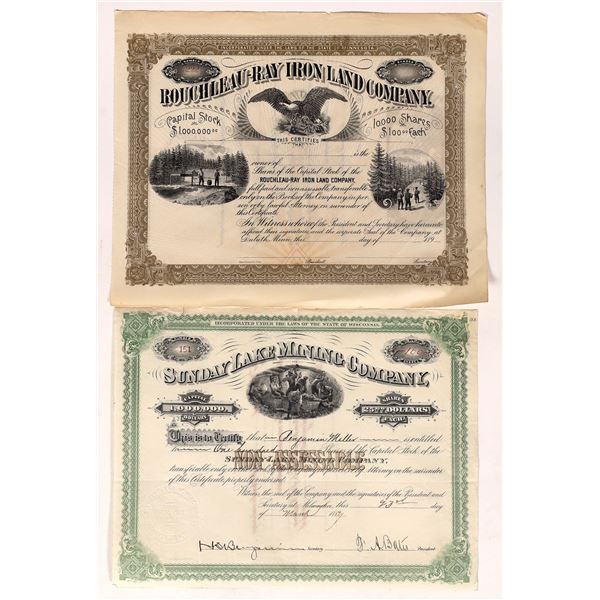 Issued 1887 Sunday Lake Mining. Unissued 1890's Rouchleau Ray Iron Land with 2 nice vignettes.