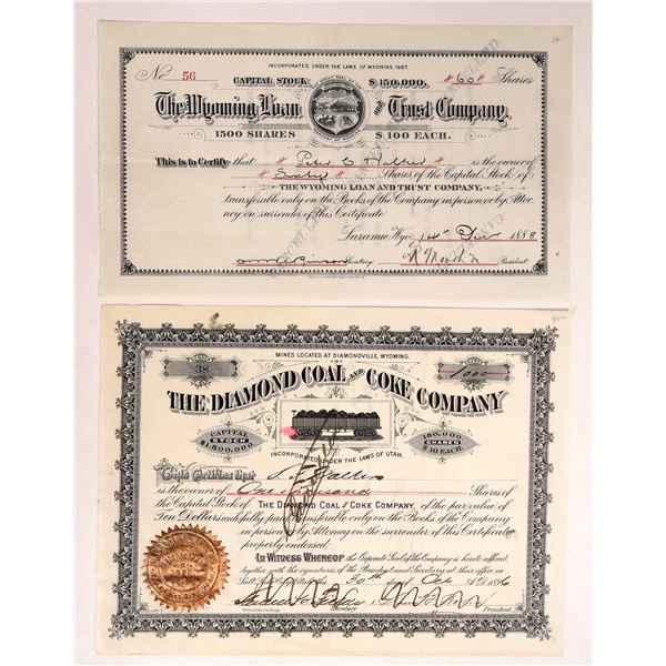 2 rare issued Wyoming stocks. 1888 Wyoming Loan and Trust, 1896 Diamond Coal and Coke.