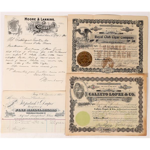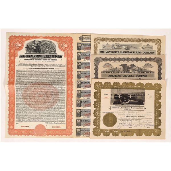 Stocks-1908 Geyserite Manufacturing, 1926 Burton Christmas, 1918 American Crucible-1" right tear. 1937 Allis Chalmers Manufacturing sample.