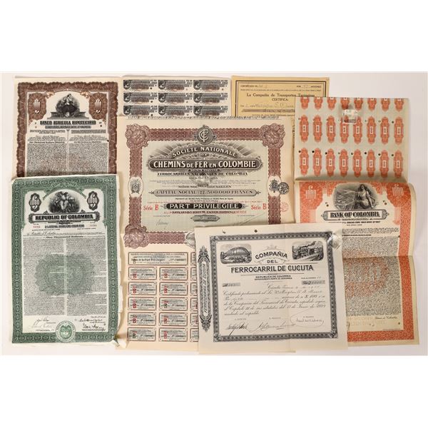 5 bonds from Columbia. 1927 Banco Agricola Hipotecario. 1940 Republic of Columbia. 1925? Societe Nationale Chemins de Feren Colombie. 1927Compania del