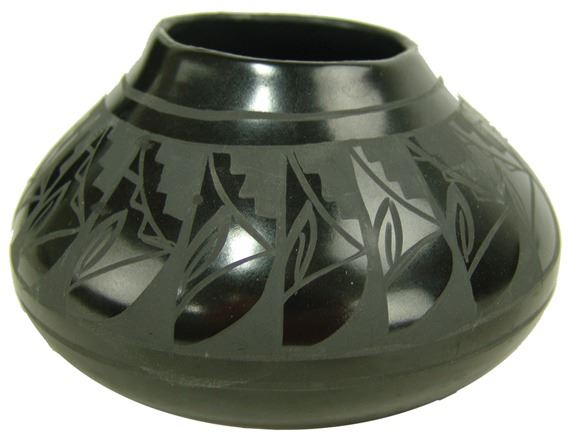 Fine low profile black-on-black pottery vessel with repeating feather design around the shoulder. Very good condition, minor scuffs. An earlier version of his original design.,Ca. 1990s,4" x 6"