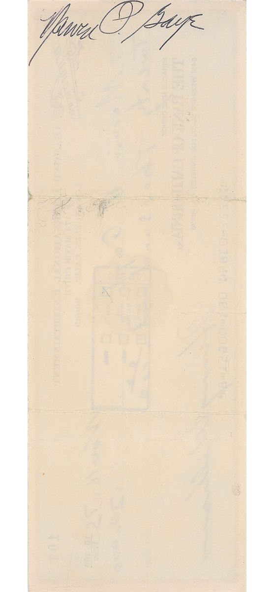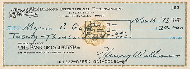 Diamond International Entertainment business check, 8 x 3, filled out and signed in another hand, payable to Gaye for $20,000.00, November 16, 1975. Endorsed on the reverse in black ballpoint, “Marvin P. Gaye.” Several vertical folds, a bank stamp to body, and a few wrinkles, otherwise fine condition.