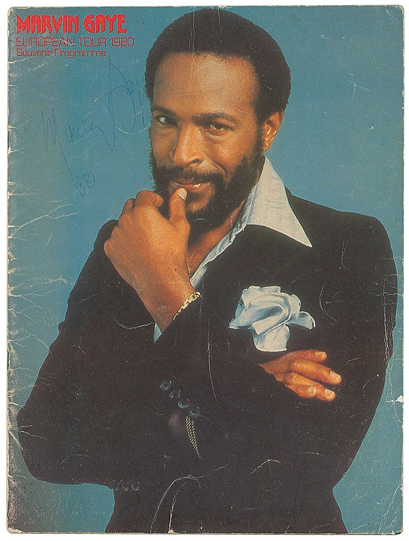 Original 1980 European Tour program, 9.25 x 12.5, signed on the front cover in blue ballpoint, “Marvin Gaye 80.” In very good condition, with moderate creasing to front and back covers. Accompanied by a letter of provenance from the original recipient stating, “This item was bought at the Southport Theatre, Merseyside…My friend and I attended with a relative who worked at the theatre and they arranged for us to go backstage after the concert to meet Marvin. The programme was signed by Marvin in front of me.” Also accompanied by a certificate of authenticity from Roger Epperson/REAL.