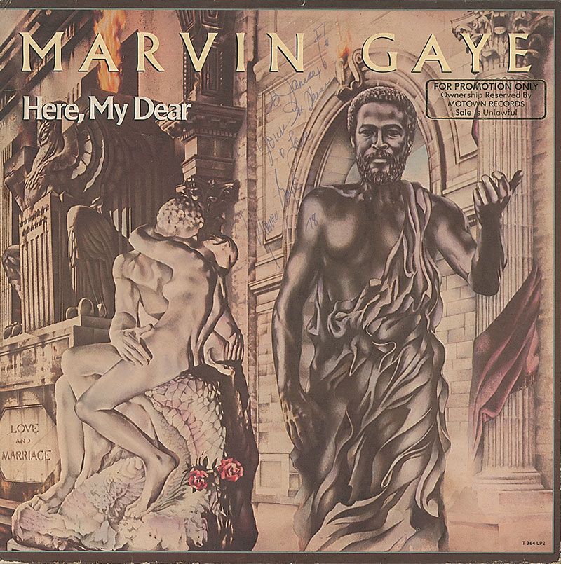 Promotional copy of Gaye’s Here, My Dear album signed and inscribed on the front cover in blue ink, “To Janice!! Yours in peace & Love, Marvin Gaye 78.” In fine condition, with some light edge wear and a gold promotional stamp to front cover. The record is not included. Accompanied by a full letter of authenticity from Roger Epperson/REAL.