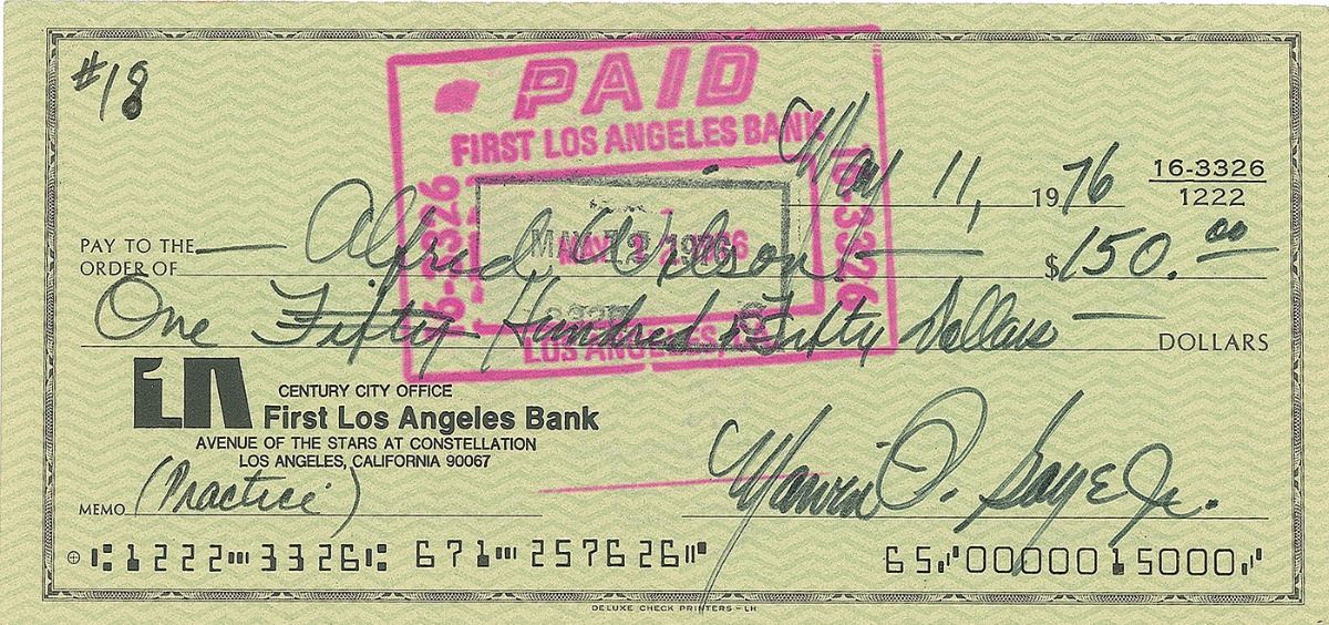 First Los Angeles Bank check, 6 x 2.75, filled out and signed by Gaye, “Marvin P. Gaye, Jr.,” payable to Alfred Wilson for $150, May 11, 1976. Memo field reads, “(practice).” In fine condition.