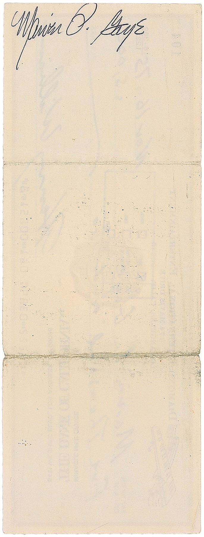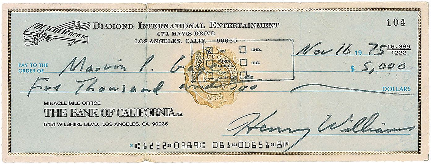 Diamond International Entertainment business check, 8.25 x 3, filled out and signed in another hand, payable to Marvin P. Gaye for $5000, November 16, 1975, endorsed on the reverse in ballpoint, “Marvin P. Gaye.” Three heavy vertical folds, otherwise fine condition.