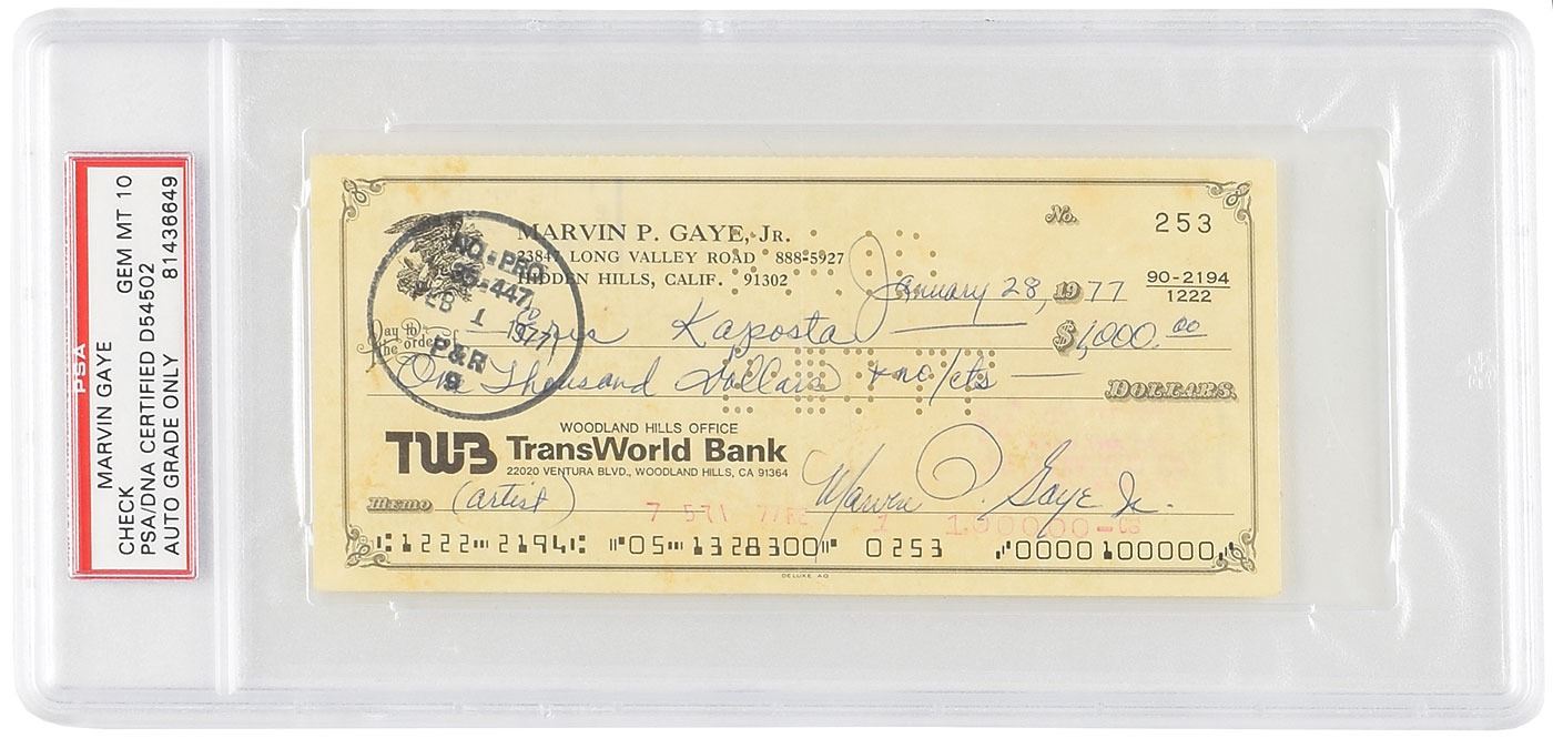 Personal check, 6 x 2.75, filled out in another hand and signed by Gaye, "Marvin P. Gaye, Jr.," payable to Eric Kaposta for $1000, January 28, 1977. Encapsulated in a plastic PSA/DNA authentication and grading holder, evaluating the autograph as "GEM MT 10." In fine condition.