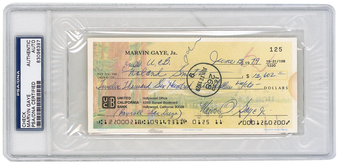 Personal check, 6 x 3, filled out and signed by Gaye, payable to U. C. B. (with the original payee Noland Smith crossed out and the change initialed) for $12,605.00, June 13, 1979. Encapsulated in a plastic PSA/DNA authentication holder. In fine condition, with small stain to right edge and expected cancellation stamps (cancellation stamps on reverse showing through behind the signature). Pre-certified Roger Epperson/REAL and RRAuction COA.
