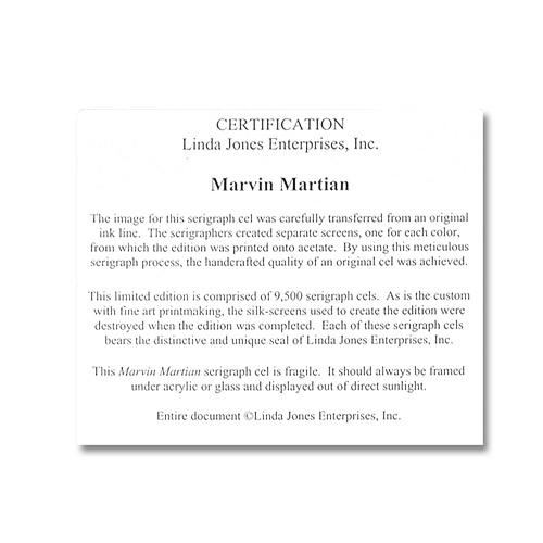 This is a meticulously crafted sericel with timeless imagery of some of the most memorable cartoon characters created by Chuck Jones (1912-2002)! "Marvin Martian" is a sold out limited edition sericel that includes Certificate of Authenticity attached in verso! Measures Approx: 6" x 8".