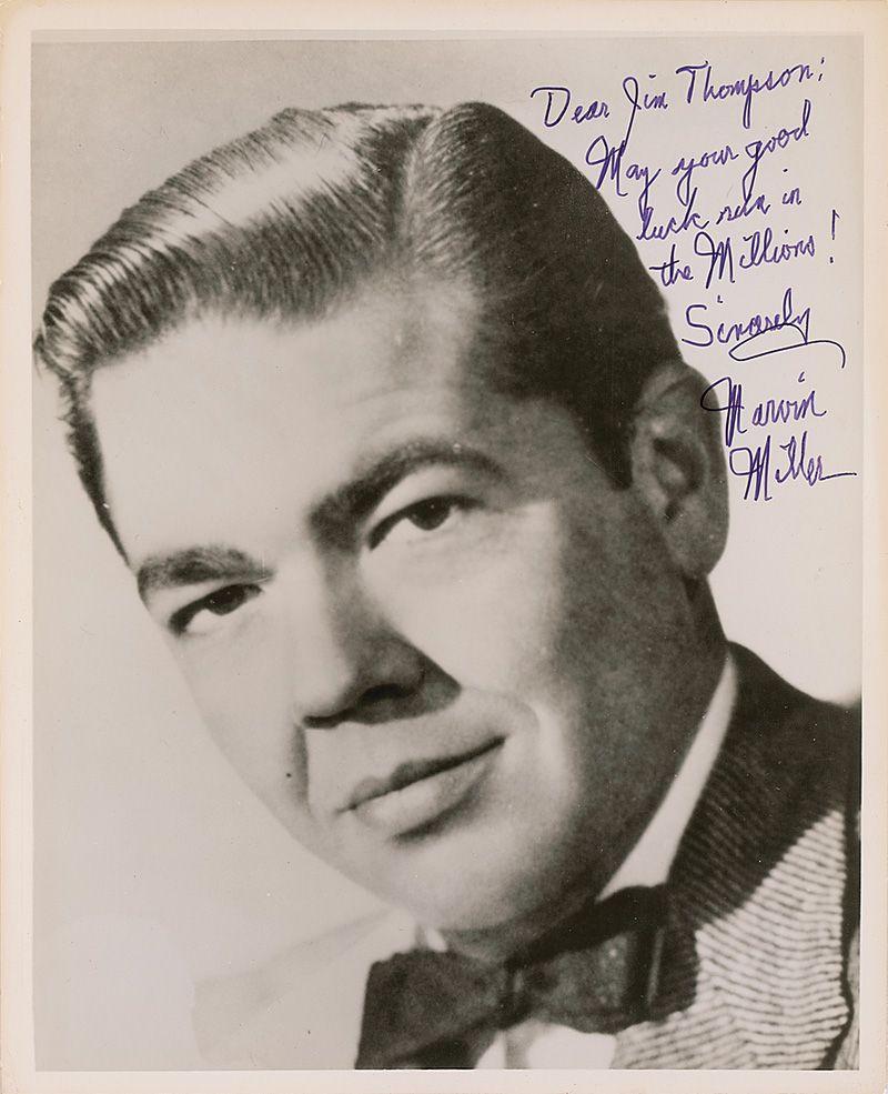 Film and voice-over actor (1913-1985) known for his role as Michael Anthony, the man who passed out a check each week on the 1950’s TV series The Millionaire. Glossy 8 x 10 photo, signed and inscribed in blue felt tip “Dear Jim Thompson: May your good luck run in the Millions! Sincerely, Marvin Miller.” In fine condition, with scattered light creases and trivial spotting to the finish.