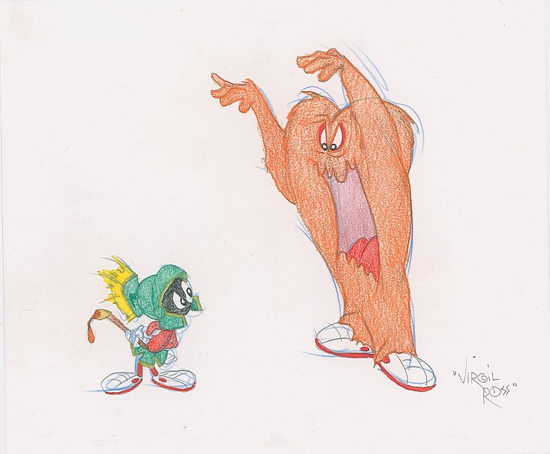 (Warner Brothers Studios, circa 1990s) Original drawing by Virgil Ross featuring Marvin the Martin and Gossamer, showing the alien holding a paint brush behind his back and the large orange monster in a scary pose. Accomplished in graphite and colored pencil on untrimmed 12.5 x 10.5 animation paper, signed at the bottom in pencil, "Virgil Ross." In fine condition. This one-of-a-kind drawing was done to be sold in the Warner Brothers Studio stores in the 1990s.