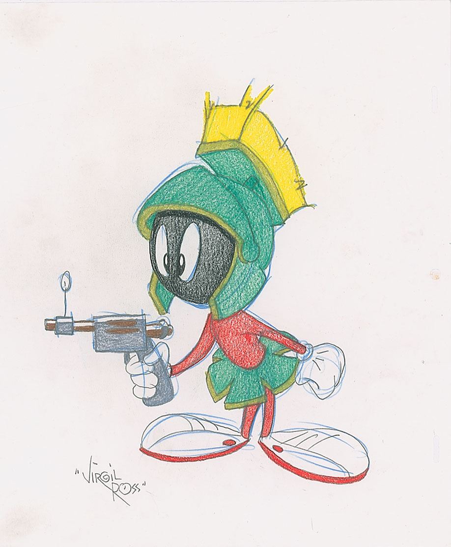 (Warner Brothers Studios, 1990s) Wonderful original drawing by Virgil Ross of Marvin the Martian armed with his ray gun in a full-length pose. Accomplished in graphite and colored pencil on untrimmed 10.5 x 12.5 animation paper, signed at the bottom in pencil, "Virgil Ross." In fine condition. This one-of-a-kind drawing was done to be sold in the Warner Brothers Studio stores in the 1990s.