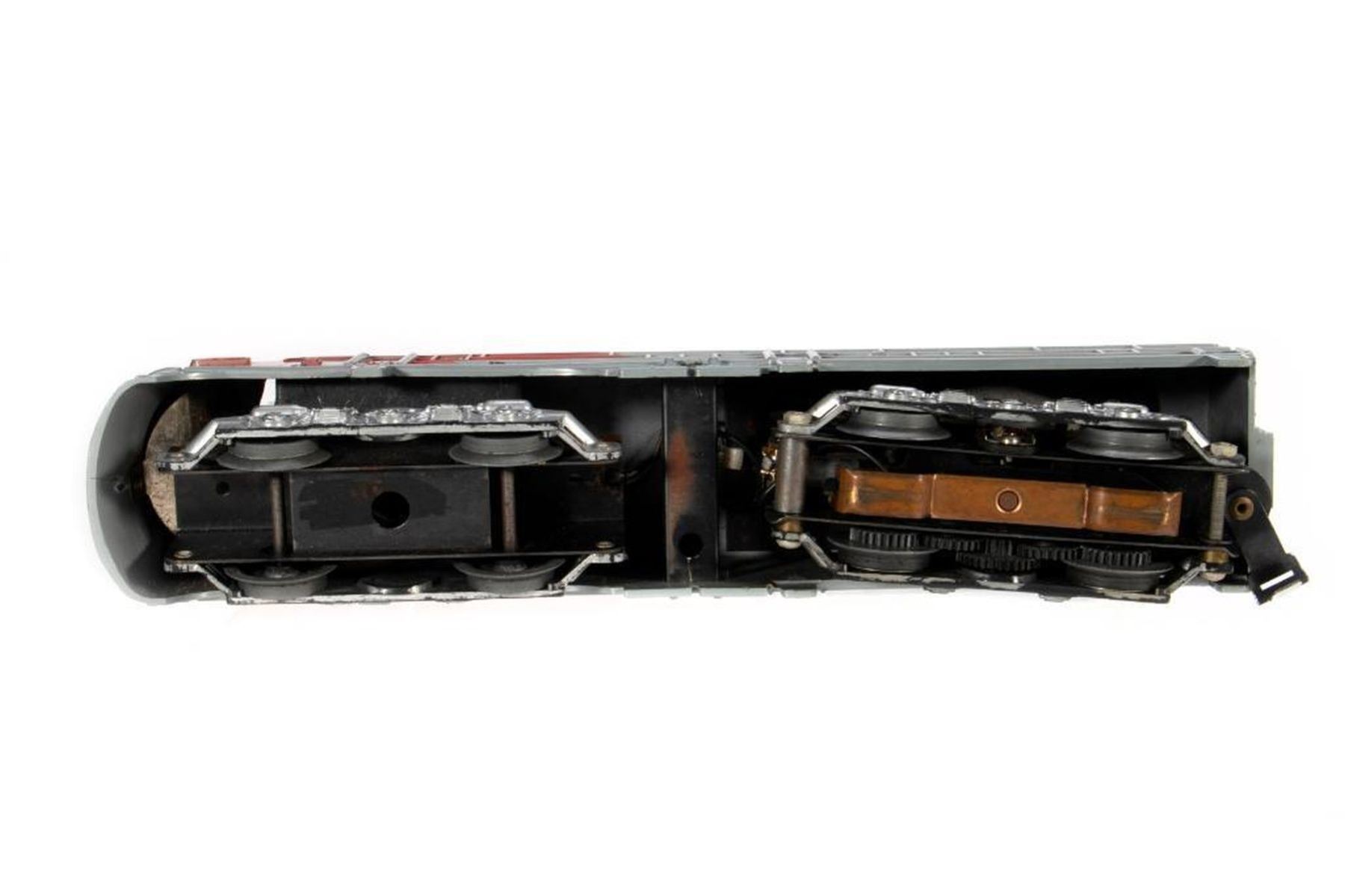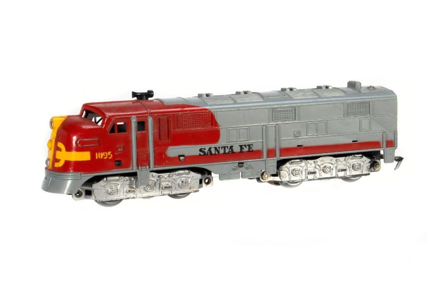 Marx 1095 Santa Fe A - A Diesels. Powered unit. Missing one horn. Steps intact but chip in the back edge of the roof. Trucks intact. Wear on the paint at the edges and other scrapes. Dummy unit. Missing one back step, and one horn. Trucks and coupler intact. Kansas City Southern tin B unit. Scratches in the lithography. Missing the coupler. Rust on trucks and axles. NYC streamline Meteor Observation. Lots of scrapes and rust. Missing all wheels. Window strips and drumhead intact.