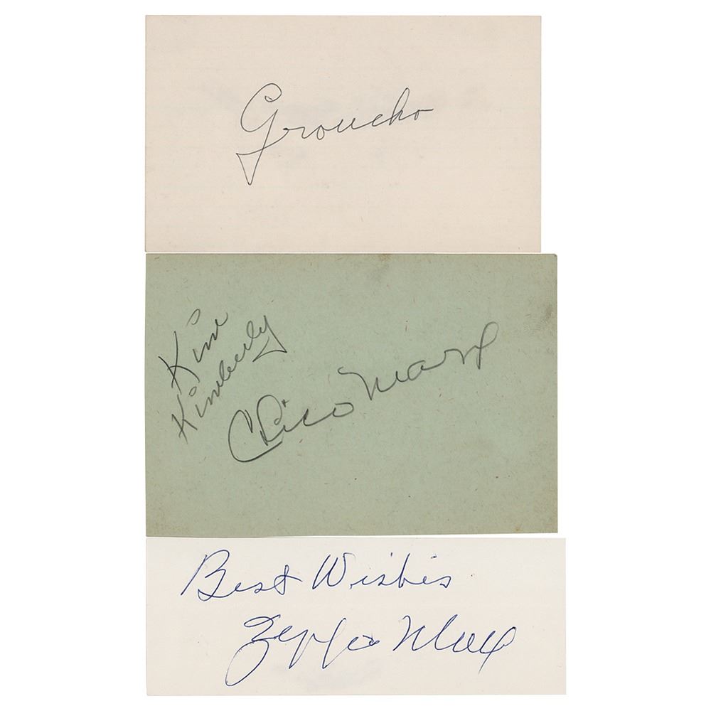 Three signatures of the Marx Bros.: a ballpoint signature of Grouch Marx, "Groucho," on an off-white 5 x 3 card; a ballpoint signature, "Best Wishes, Zeppo Marx," on a white 5.25 x 2 slip; and a pencil signature, "Chico Marx," on a light green 5.25 x 3.5 album page, also signed by Kim Kimberly. In overall fine condition.