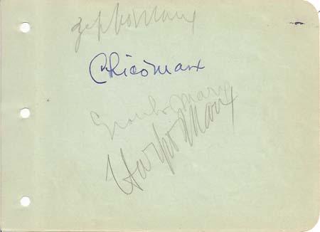 Vintage signatures, circa 1932, of Zeppo Marx, Chico Marx, Groucho Marx and Harpo Marx. Signed upon a 6'' x 4'' pale green album page in pencil with the exception of Chico who signed in blue fountain pen. Near fine condition, with punch holes and a vertical crease at the left, and a stray stain at the far top right, well away from the signatures. Very attractive.