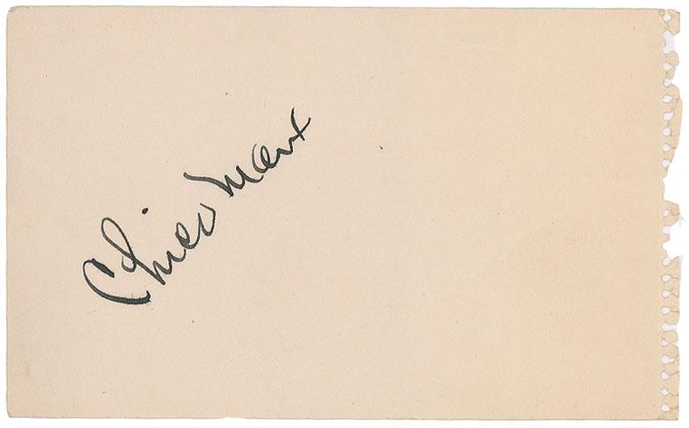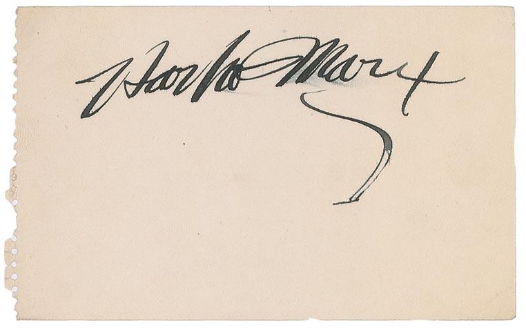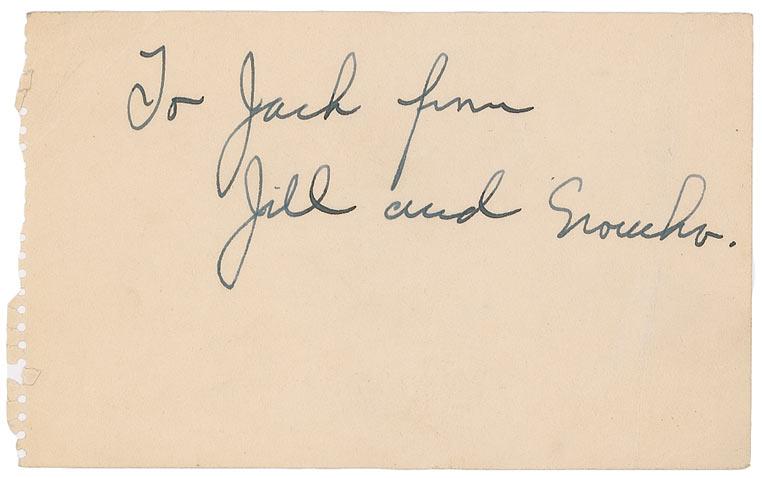 Vintage fountain pen signatures, “Harpo Marx,” “Chico Marx,” and “To Jack from Jill and Groucho,” on individual off-white 5 x 3 album pages. In fine condition, with uniform toning to each page and a light brush to Harpo’s signature.