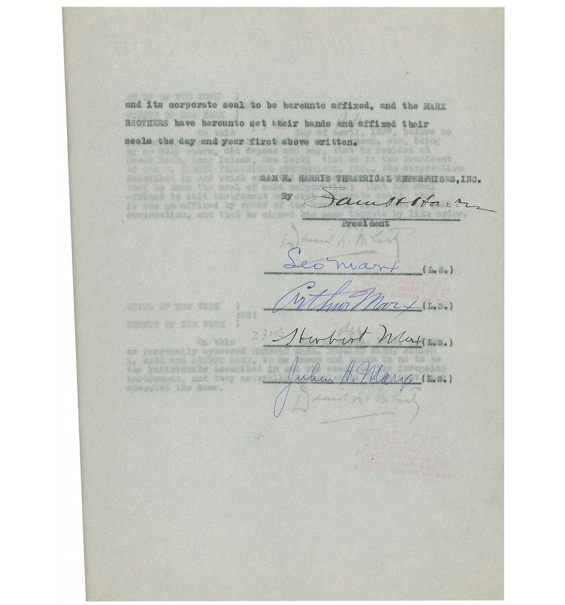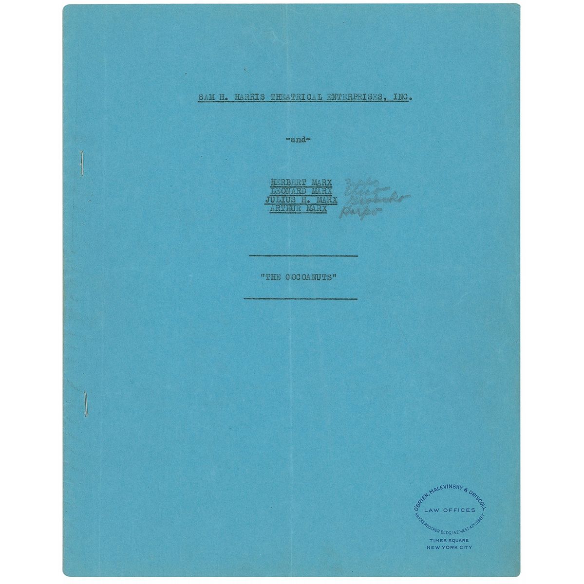 DS, signed with their legal names, “Leo Marx,” “Arthur Marx,” “Herbert Marx,” and “Julius H. Marx,” six pages, 9 x 11.25, September 23, 1927. A remarkable agreement between the Marx Brothers and their management company, Sam. H. Harris Theatrical Enterprises, Inc. regarding the theatrical production of ‘The Cocoanuts,’ in which the parties desire “to extend the period of this agreement for an additional theatrical season…of 1927–1928…and to continue for and during the life of the dramatico-musical season. That in lieu of the compensation provided for in the aforesaid agreement dated the 5th day of December, 1924, the Manager agrees to pay to the Marx Brothers and the Marx Brothers agree to accept the sum equivalent to fifteen perfect (15%) of the gross weekly box office receipts derived from the performance and representation of…’The Cocoanuts,’ accompanied by true and accurate statements showing the receipts of every performance given by said Marx Brothers” and “an amount equivalent to fifty percent (50%) of the net profits derived from the business of performing and representing…’The Cocoanuts’ with the Marx Brothers rendering services in said play for and during the period of the theatrical season of 1927–1928…It is agreed that the compensation of the Marx Brothers, pursuant to this agreement, shall be subject to no minimum guarantee, and that in the event of Herbert Marx refusing to comply with this agreement, the compensation to be paid to the remaining Marx Brothers shall be reduced by $250.00, and, also, in the event of any of the other Marx Brothers shall be reduced by one-third of the difference between their compensation, as herein provided, and the sum of $250.00.” Contract is housed in the original blue legal folder. In fine condition, with a light central vertical fold, passing through the first letters of each signature, light creasing, and a pencil notation of their stage names on the front cover of the folder.