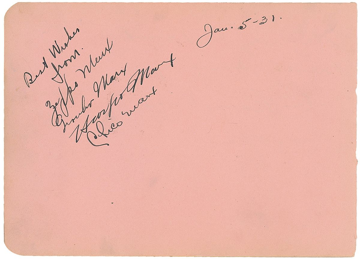 Vintage fountain pen signatures, “Best wishes from Zeppo Marx,” “Groucho Marx,” “Harpo Marx,” and “Chico Marx,” on a light pink 7.5 x 5.5 album page, with a collector’s date notation of January 5, 1931 along the top. In fine condition, with a bit of scattered light soiling. A great set of uninscribed signatures of the comedy legends all on the same page.