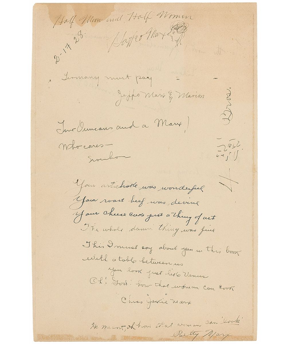 Vintage ink signatures of all four Marx Brothers on a large off-white 10.25 x 15.5 guestbook page dated February 17, 1928, all adding some sort of humorous sentiment: “Half Man and Half Women [sic], Harpo Marx,” adding a small portrait sketch; “Germany must pay, Zeppo Marx and Marion”; “Two Duncans and a Marx! Who cares—Groucho”; and “Your artichoke was wonderful / Your roast beef was devine [sic] / Your cheese cake just a thing of art / The whole damn thing was fine. / This I must say about you in this book / with a table between us / You look like Venus / Oh! God! how that woman can cook. Chico ‘Jackie’ Marx.” At the bottom, Chico’s wife adds, “He meant, oh how that woman can ‘look.’ Betty Marx.” Another vertical notation to the right side (likely in Groucho’s hand) reads, “4 [scribbles] Bros.,” with the random scribbled marks a pictogram to signify ‘Marx.’ A central horizontal fold and some staining to edges (affecting the first few words of Harpo’s sentiment), otherwise fine condition. At this time, the brothers were Broadway sensations, having found success with I'll Say She Is and The Cocoanuts, soon to be followed by Animal Crackers in October 1928; they would soon transition to film, releasing screen adaptations of the latter two musicals through Paramount in 1929 and 1930. All four Marx Brothers are very rarely encountered on a single item, and this exceptional piece aptly captures their legendary sense of humor at a relatively early date.