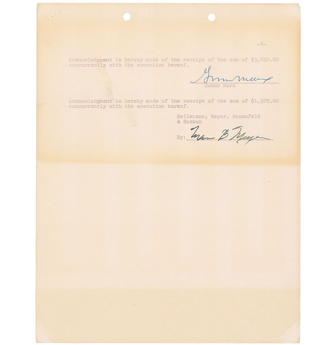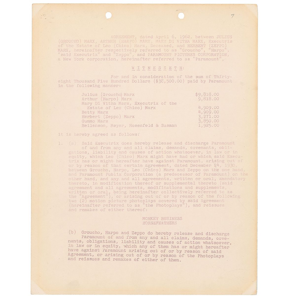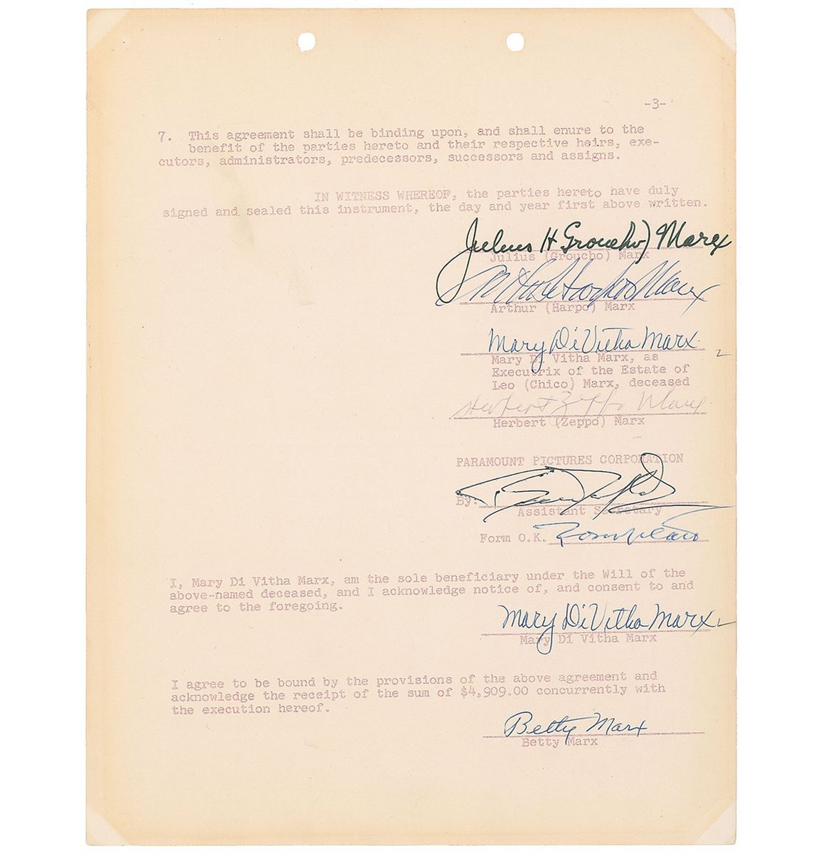 DS, signed by all four brothers using their full legal signatures, three pages of a four page document, 8.5 x 11, April 6, 1962. Agreement between Groucho, Harpo, Zeppo, and Gummo and Paramount Pictures concerning the release of the estate of Chico Marx from a 1930 contract involving the Marx Brothers and re-releases of Monkey Business and Horse Feathers, as well as a cash payout of a total of $38,500.00 divided between the brothers, Chico’s two wives, and a law firm. Signed on the last two pages, “Julius H. (Groucho) Marx,” “Arthur Harpo Marx,” “Herbert Zeppo Marx,” “Mary DiVitha Marx,” “Betty Marx,” and “Gummo Marx.” Second page missing, mild toning, expected document wear, and uniform fading to typed text, otherwise fine condition. Horse Feathers, in which the brothers satirized the American College system and Prohibition, was one of their most popular films, and landed the brothers on the cover of Time magazine. Chico Marx, the oldest of the five, had passed away on October 11, 1961, last appearing with the Marx Brothers in the 1950 film Love Happy.