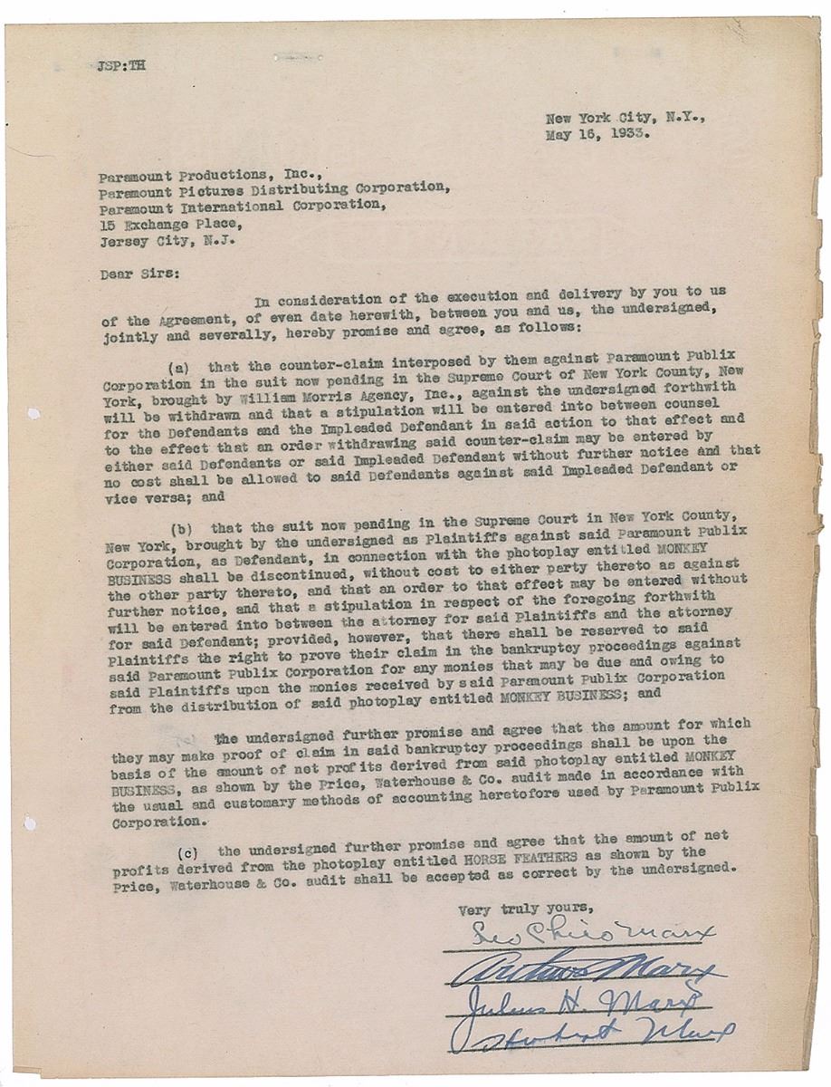 At this time the Marx Brothers were engaged in a bitter contract dispute with Paramount over royalties from their recently released films, including the two mentioned here. Released in 1931, Monkey Business was a success at the box office and today is remembered as one of their greatest films; they followed up with Horse Feathers in 1932, which was Paramount's highest-grossing film of the year. According to the lawsuit, Paramount owed them $205,000 from the profits of Monkey Business. As they had not been paid, the brothers threatened to walk out on their Paramount contract—with one film left to go—and form their own production company. They managed to reach a settlement, however, and on the same day as this document signed a deal with Paramount to make their final film for a flat salary of $300,000. This final Paramount film, Duck Soup, was a box office disappointment despite its status as a masterpiece today.