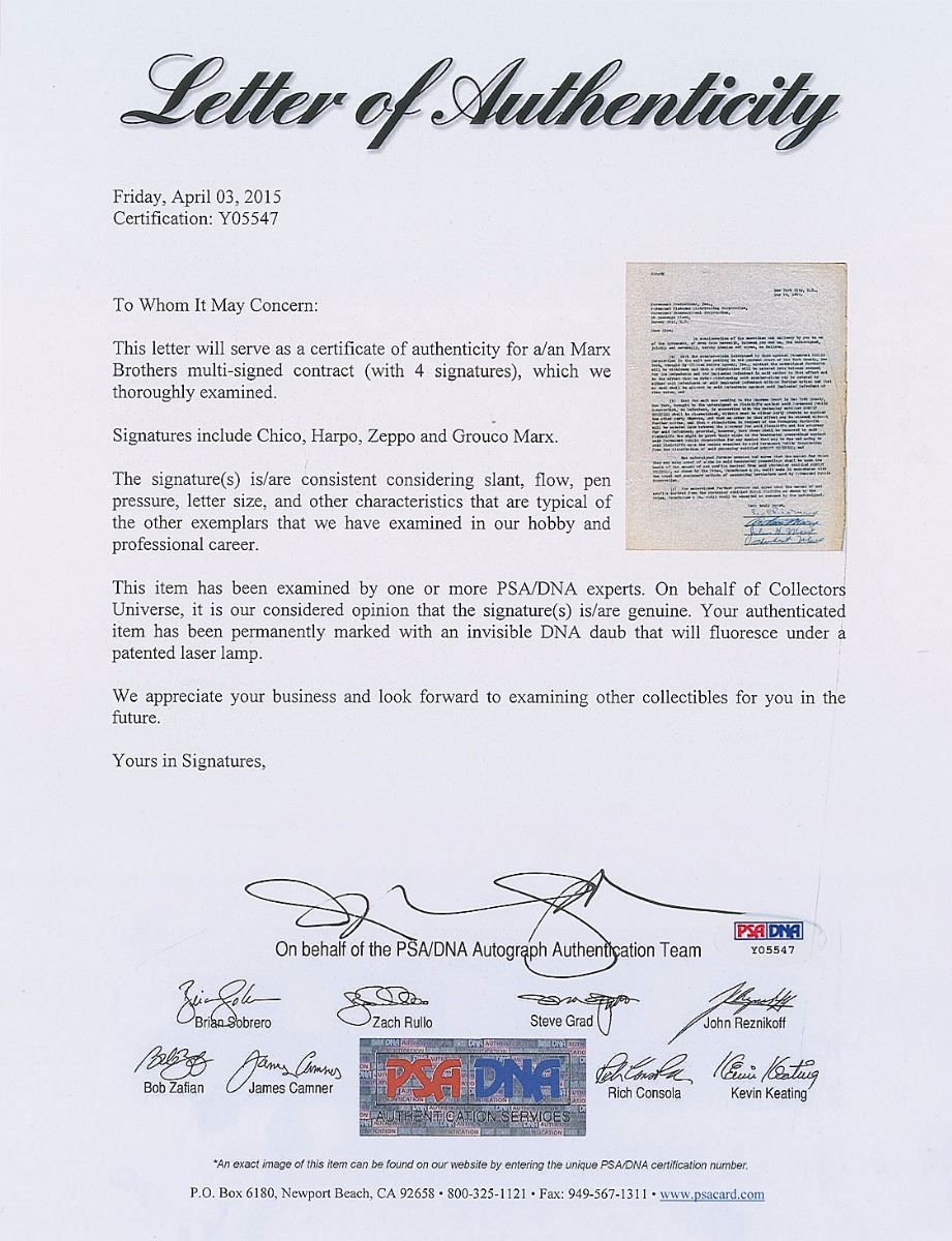DS, signed by four Marx Brothers using their given names, one page, 8.5 x 11, May 16, 1933. Agreement between the Marx Brothers and Paramount Productions, Inc., concerning their lawsuit against the studio. In part: “The undersigned, jointly and severally, hereby promise and agree…that the suit now pending in the Supreme Court in New York County, New York, brought by the undersigned as Plaintiffs against said Paramount Publix Corporation, as Defendant, in connection with the photoplay entitled Monkey Business shall be discontinued, without cost to either party…provided, however, they there shall be reserved to said Plaintiffs the right to prove their claim in the bankruptcy proceedings against said Paramount Publix Corporation for any monies that may be due…by said Paramount Publix Corporation from the distribution of said photoplay entitled Monkey Business…upon the basis of the amount of net profits derived from said photoplay entitled Monkey Business…the undersigned further promise and agree that the amount of net profits derived from the photoplay entitled Horse Feathers…shall be accepted as correct.” Nicely signed at the conclusion in fountain pen by Chico, “Leo Chico Marx”; Harpo, “Arthur Marx”; Groucho, “Julius H. Marx”; and Zeppo, “Herbert Marx.” Expected document wear and toning, creasing, and small tears along the right edge, otherwise fine condition. Accompanied by a full letter of authenticity from PSA/DNA.