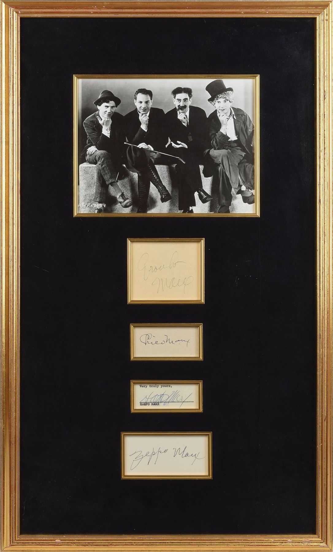 Marvelous set of four ink signatures of the Marx Brothers, "Groucho Marx," "Chico Marx," "Harpo Marx," and "Zeppo Marx," on individual slips and cards of various sizes. Nicely matted and framed with a portrait of the famed comedy family to an overall size of 17 x 29. In fine condition.