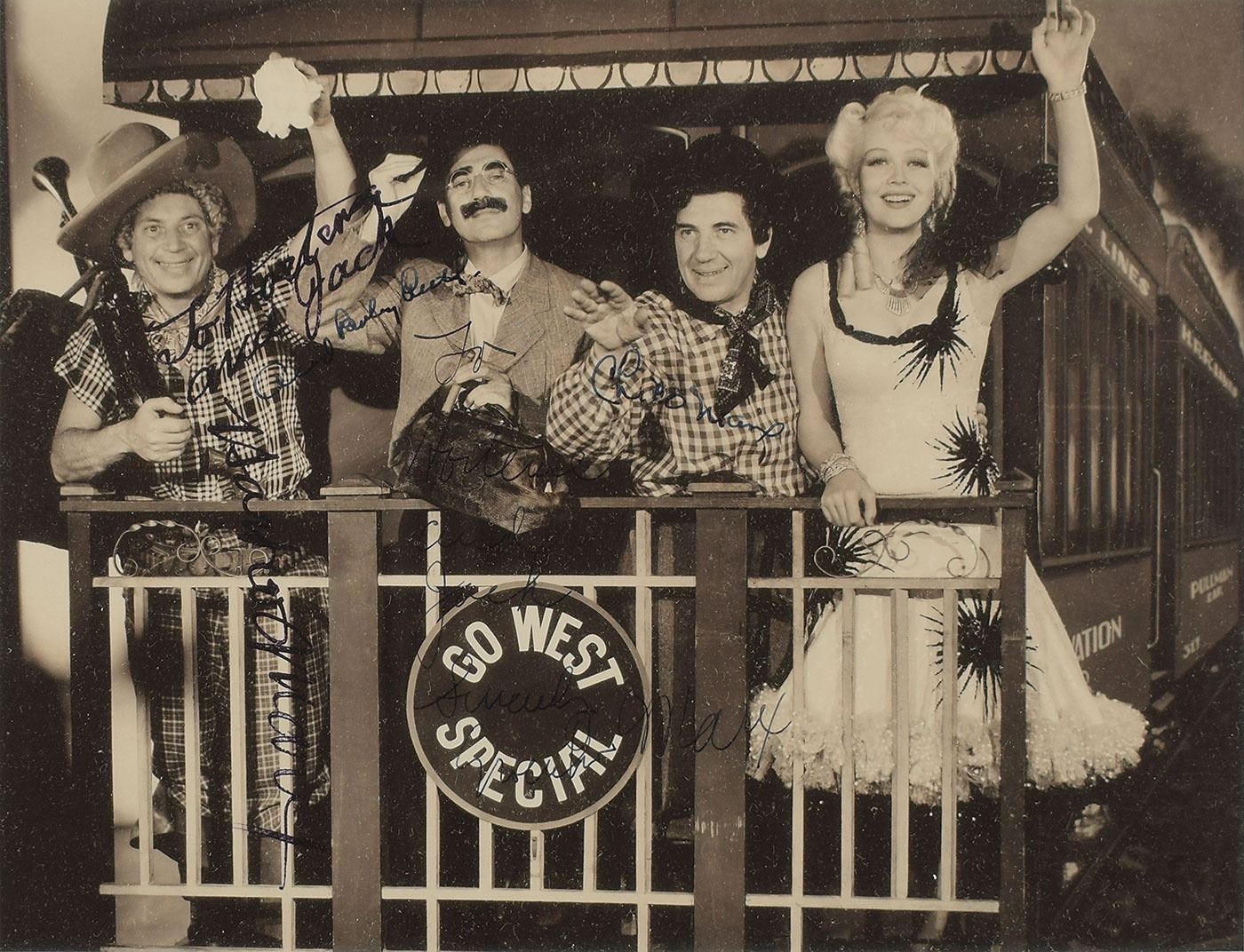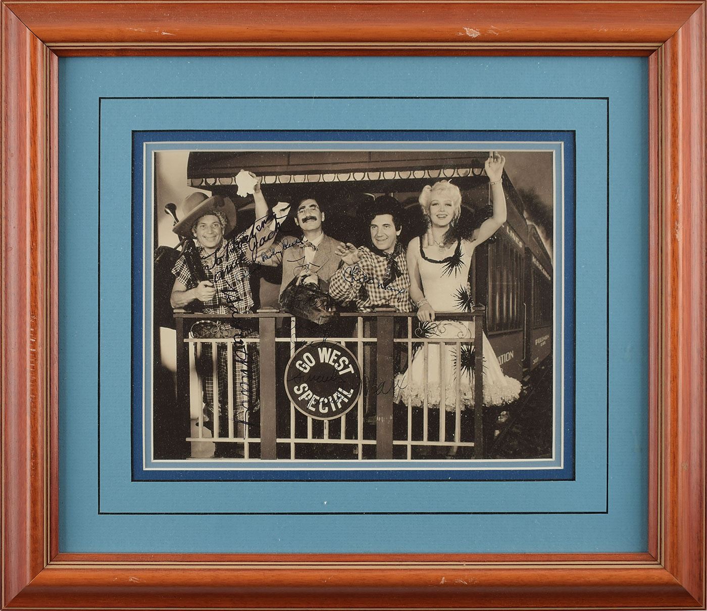 Vintage matte-finish 9 x 7 photo of the Marx Brothers waving with June MacCloy during a scene from the 1940 comedy-western Go West, signed and inscribed in fountain pen, "To Hortence and Jack, Harpo Marx," "To Hortence and Jack, Sincerely Groucho Marx," and "Chico Marx.” Another hand has added a line to the Harpo inscription. Triple-matted and framed to an overall size of 15.75 x 13.75. In fine condition, with poor contrast to Groucho's signature.