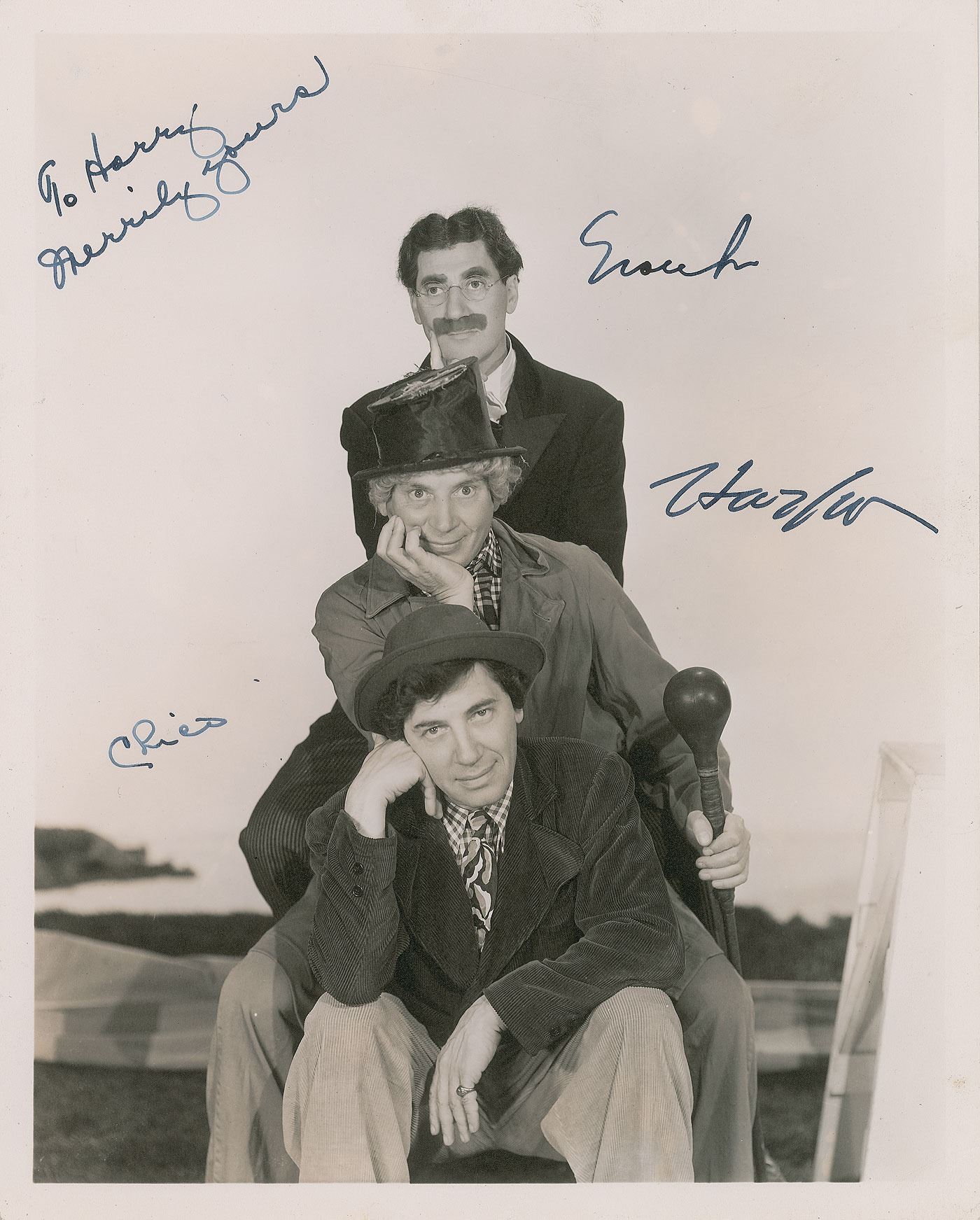Vintage matte-finish 8 x 10 photo of the three elder Marx brothers posing together against a coastal backdrop, signed in fountain pen, "Chico," "Harpo," and "Groucho," with an inscription added by an unknown hand. In fine condition. An exceptional portrait of the comedic core of the famed Marx brothers troupe, an example made all the more desirable by its excellent condition and bold autographs.
