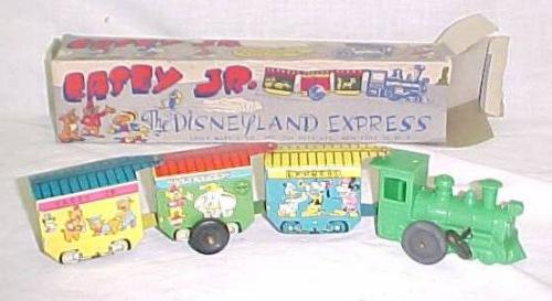 Wind-UP Casey Jr. Disneyland Express Train by Marx with plastic wind up engine and 3 colorful cars depicting 3 Pigs & The Wolf, Donald, Goofy, Dumbo, etc. VG Cond. Box has some roughness. One end flap has tear.