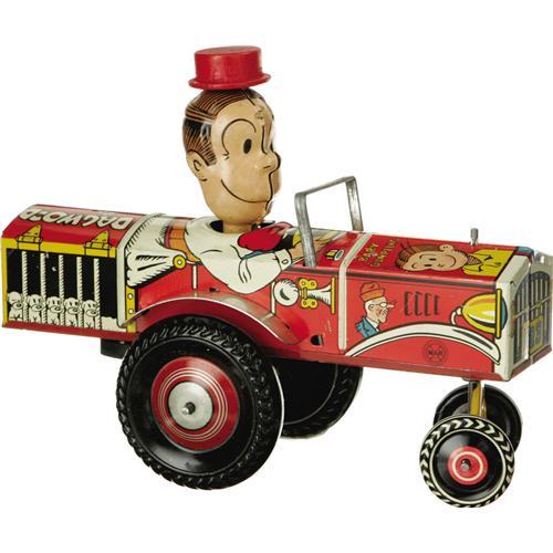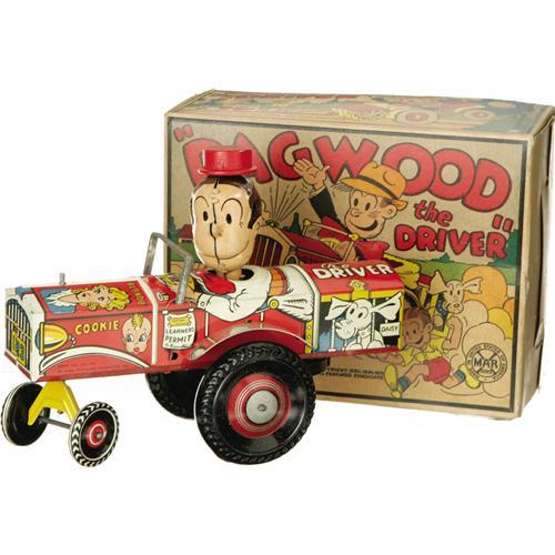 <B>Marx<I> "Dagwood the Driver"</B></I></B></I> <B>Wind-up Toy in Original Box.</B></I><BR>Virtually new in original box, tin litho, 8" long x 6" tall, Marx maker's mark present on side of car, copyright King Features Syndicate 1930, 1934, 1935. <BR><B>Condition</B></I> Toy near mint and in working condition with only box wear. Box complete, colors still bright, tabs on end bent with slight tears, and storage wear.<BR><BR><b>Shipping:</b> Miscellaneous Collectibles, Larg (<a target="_blank" href="http://www.heritageauctions.com/common/shipping.php">view shipping information</a>)